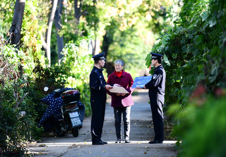 10月9日,安徽省阜南县公安局城西派出所民警在辖区一居民家门口宣讲防范网络电信诈骗和养老诈骗常识。