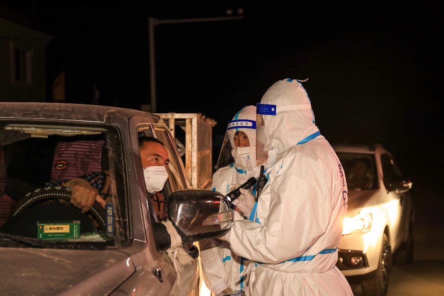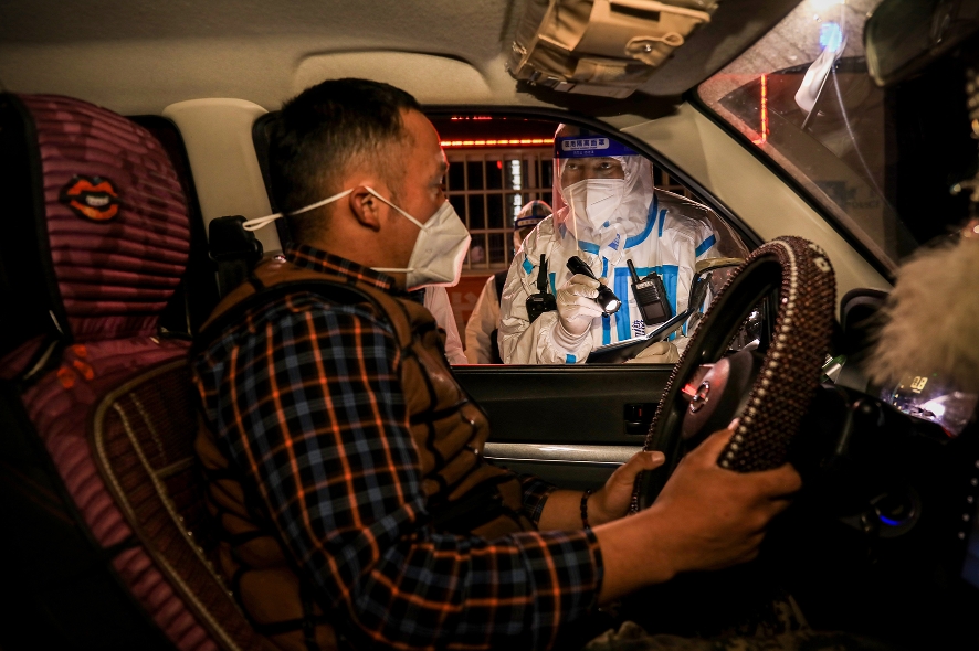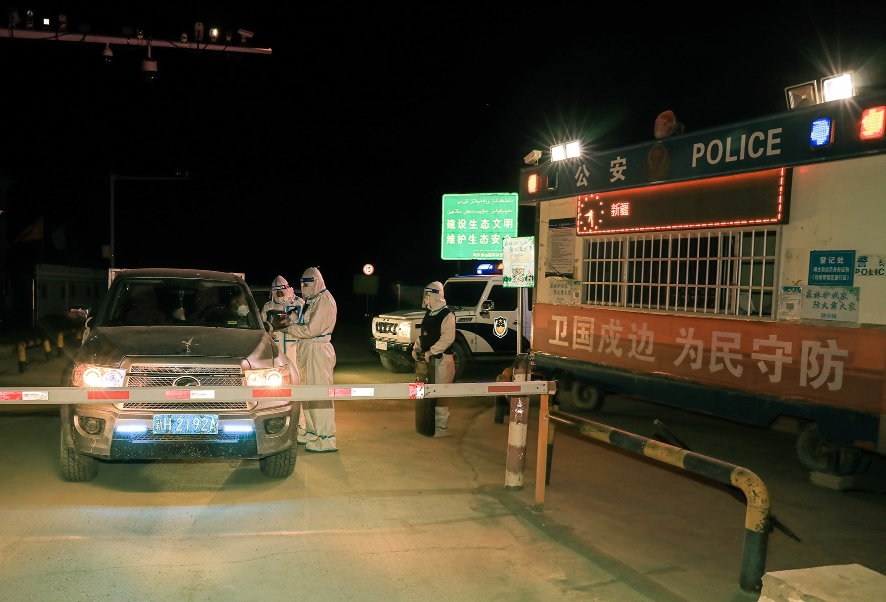 10月13日,新疆阿勒泰地区富蕴县边境山区气温骤降,部分山区夜间温度低至1℃。为了做好边境前沿管理和疫情防控工作,新疆出入境边防检查总站阿勒泰边境管理支队富蕴大队库卫边境警务站民辅警坚守岗位一线,对来往边境前沿车辆进行人证核对和疫情、行车安全教育,全力确保人员车辆安全和边境辖区治安平稳。