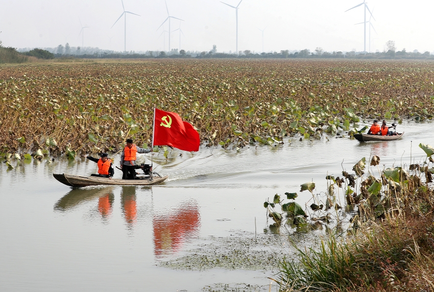 10月31日,在湖北省沙洋县借粮湖水域,沙洋县公安局毛李水陆派出所河湖警长与村干部开展生态保护例行巡查。今年以来,沙洋县公安局推进河湖警长工作机制,在汉江、长湖等江河湖泊开展生态环境保护巡查,严厉打击污染环境、非法捕捞、非法采砂等违法犯罪,为保护生态环境筑牢法治屏障。