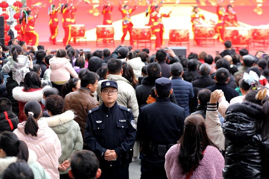 2月5日,安徽省舒城县公安局城中派出所民辅警在传统民俗表演活动现场巡逻守护。