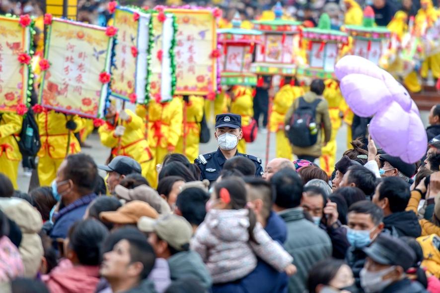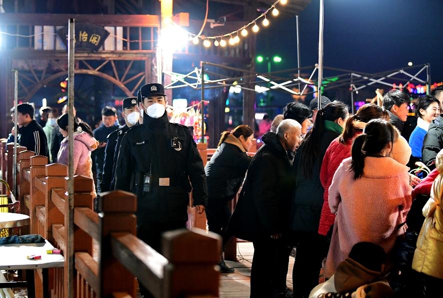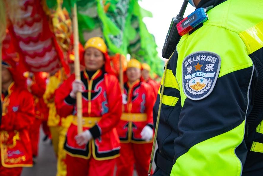 2月5日,山东省滕州市公安局全体上岗保障2023年元宵节民间游艺展演活动。