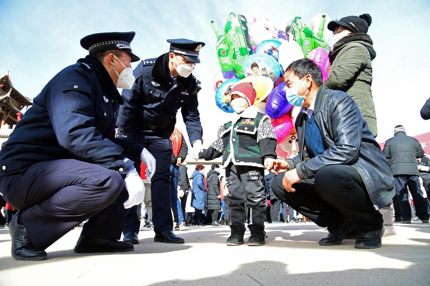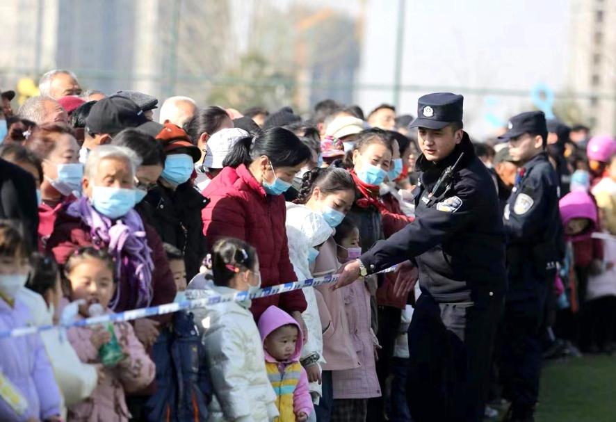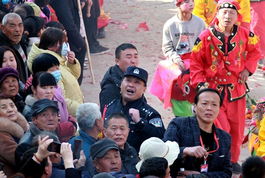 2月4日,陕西大荔县公安局多警联动,值守在传统社火表演现场。
