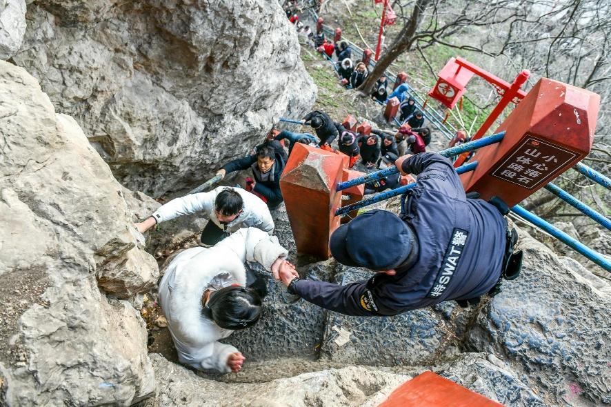 2月5日,安徽省和县鸡笼山迎来一年一度的传统庙会祈福活动。为保障群众出行安全,和县公安局组织警力于凌晨4时到岗,对傍山险路进行疏导,保障群众登山安全。