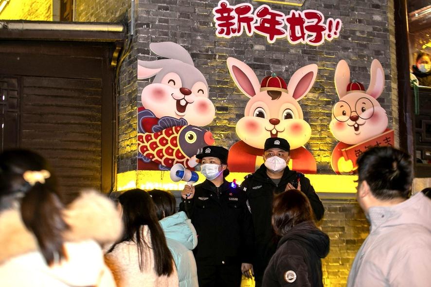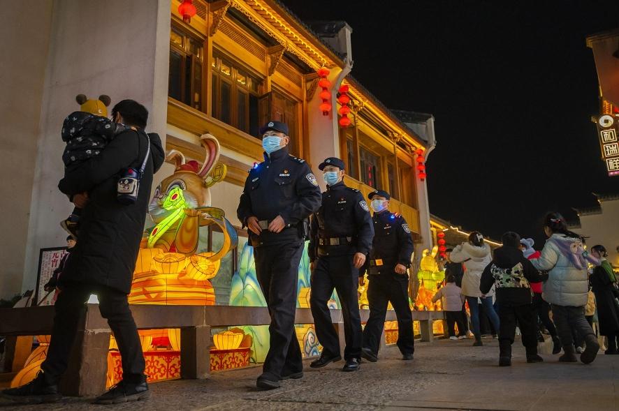 2月4日晚,安徽省芜湖市镜湖分局民辅警在网红打卡地古城景区巡逻执勤,守护百姓平安。