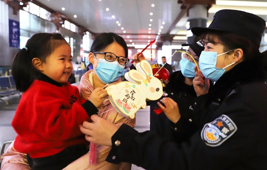 2月5日,元宵佳节,杭州铁路公安处台州站派出所温岭警务室的民警在候车大厅为小朋友送上元宵节礼物。