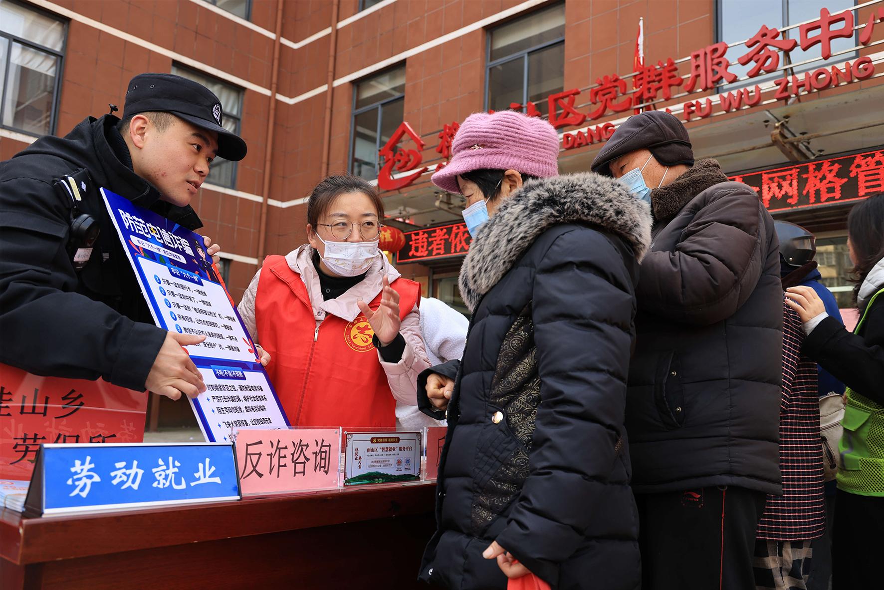 图为民警与志愿者向现场群众开展普法、反诈宣传。