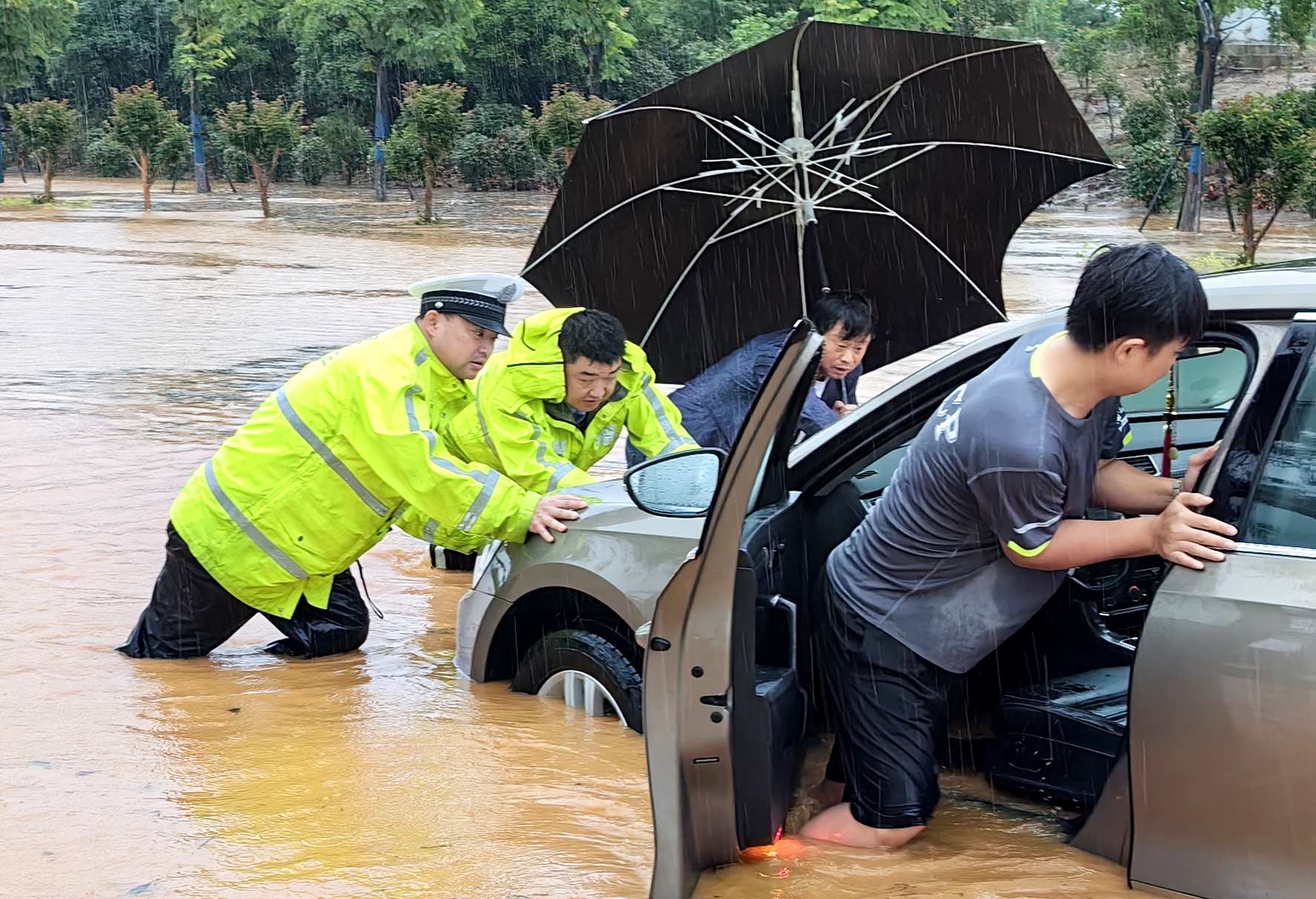 5月27日,安徽省安庆市公安局交警支队五大队民警在经开区天柱山东路段对被困积水中的车辆实施救援。