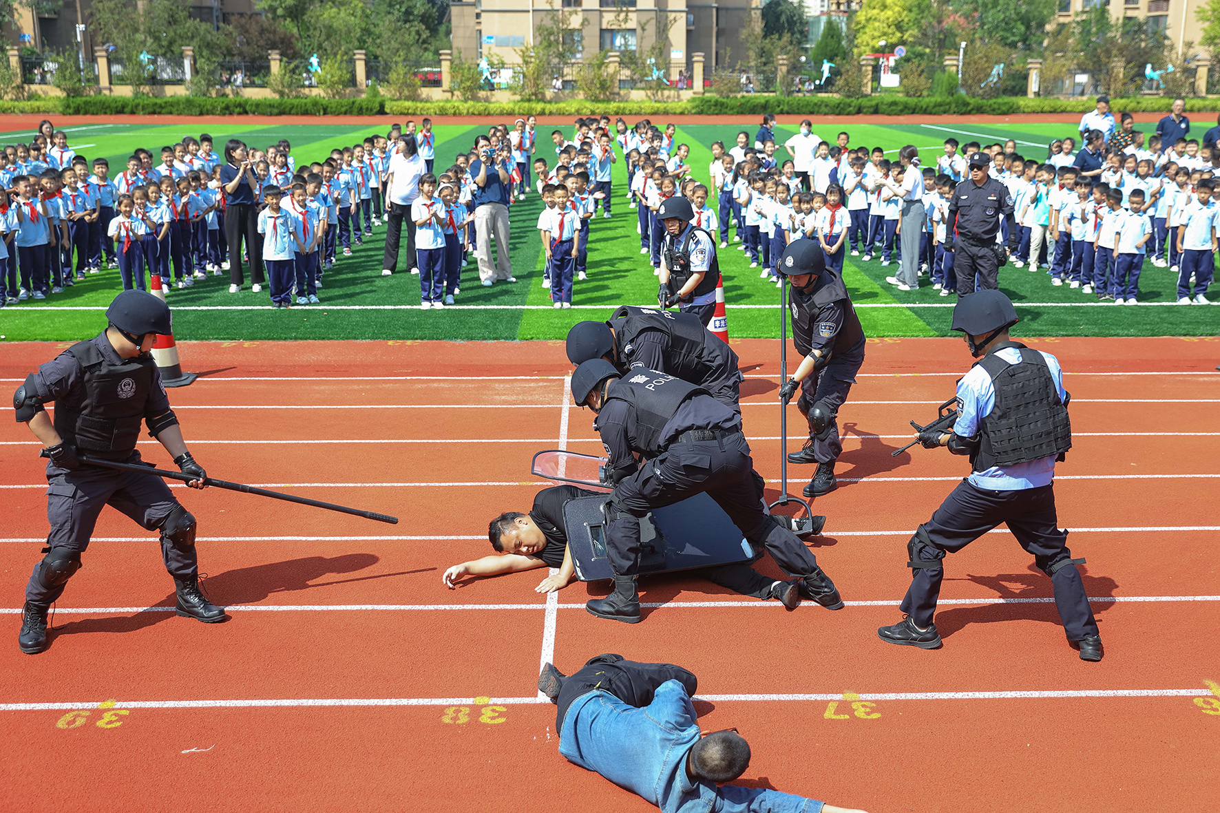 8月30日,河南省郑州市公安局金水分局巡特警与花园路派出所的民辅警为辖区学校师生开展上好“开学第一课”活动。