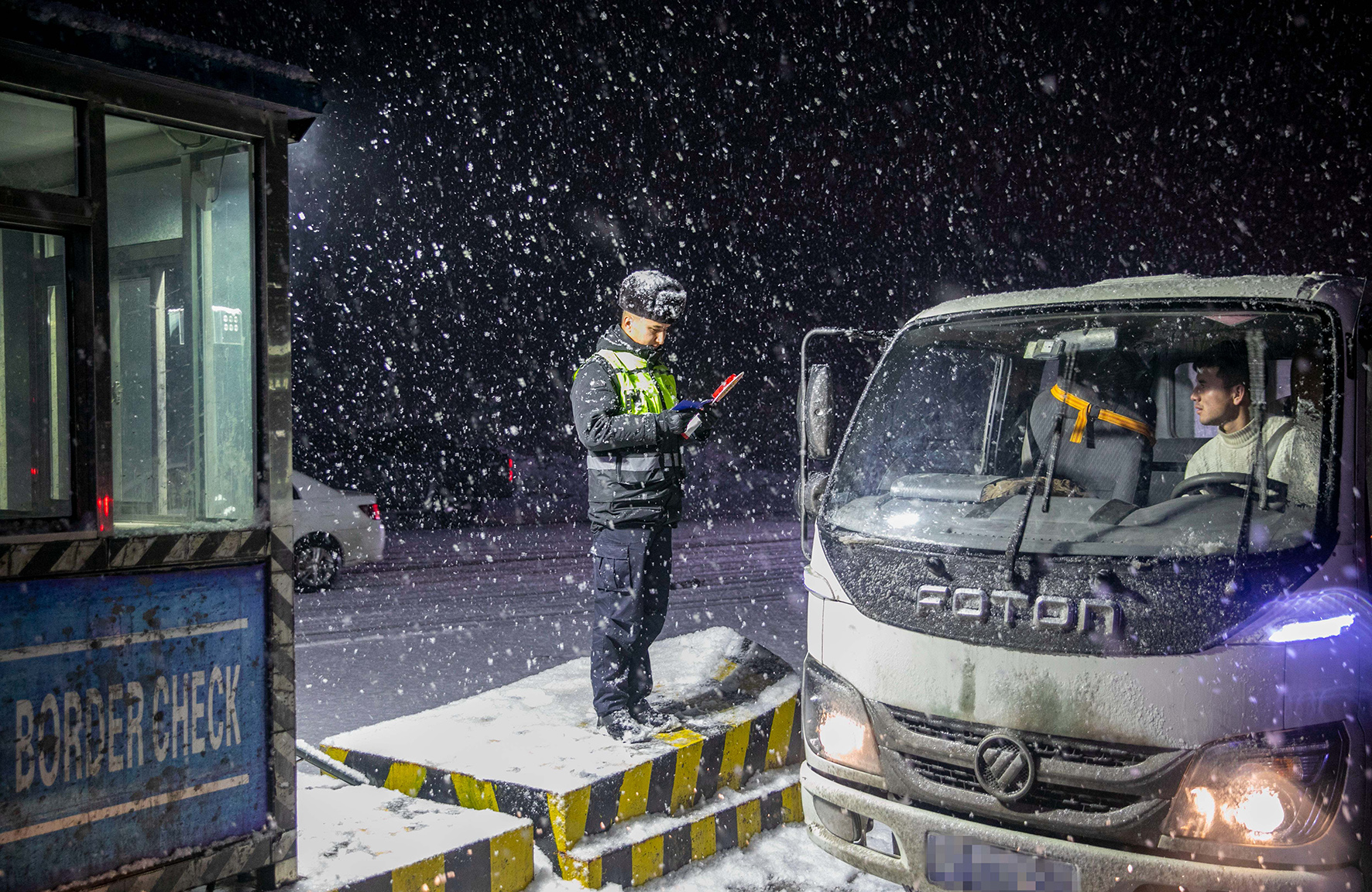 12月20日夜,新疆伊犁州部分地区迎来大雪天气。守卫着霍尔果斯市东大门的伊犁边境管理支队八十间房子边境检查站民警在风雪中坚守岗位,严密查缉过往车辆,全力以赴保障道路畅通和群众安全出行,确保边境辖区安全稳定。