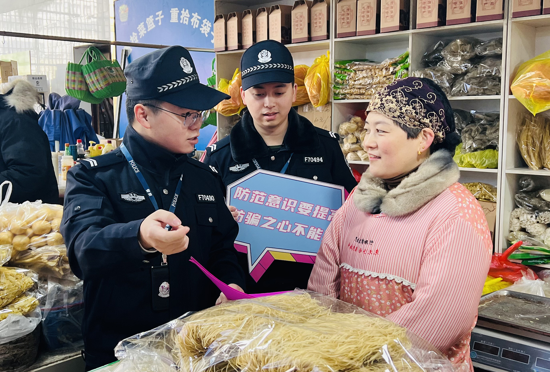 图为12月21日,民辅警在平桥镇八角亭村向沿街商户宣讲反诈知识。
