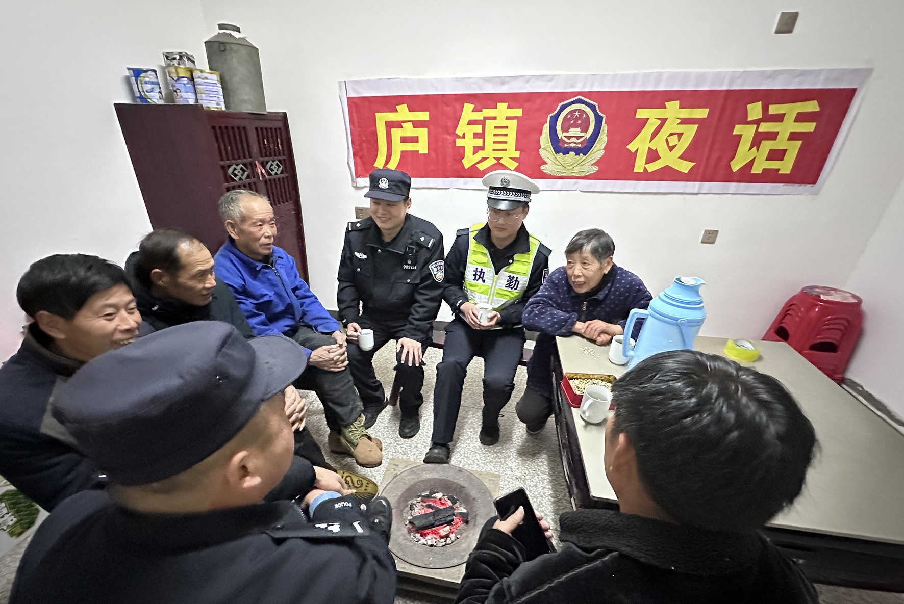 12月24日傍晚,安徽省舒城县公安局庐镇派出所民警辅警利用山区村民晚间空闲时间,走进辖区小街村组织开展“庐镇夜话”。民警通过“拉家常”“唠唠嗑”形式面对面征集村民意见、帮助解难释疑、化解矛盾,同时进行安全防范宣传。