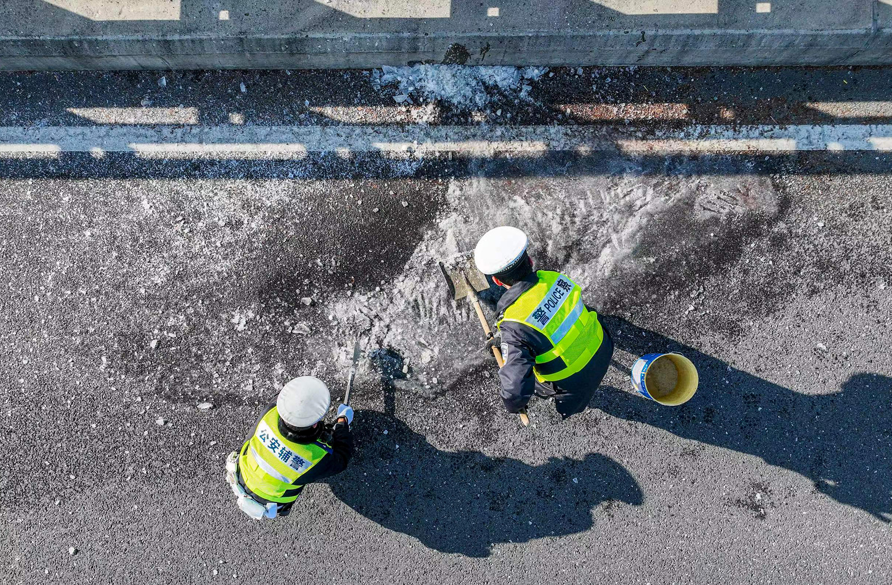 图为民警辅警在崇明大道东平河大桥上清理路面结冰。