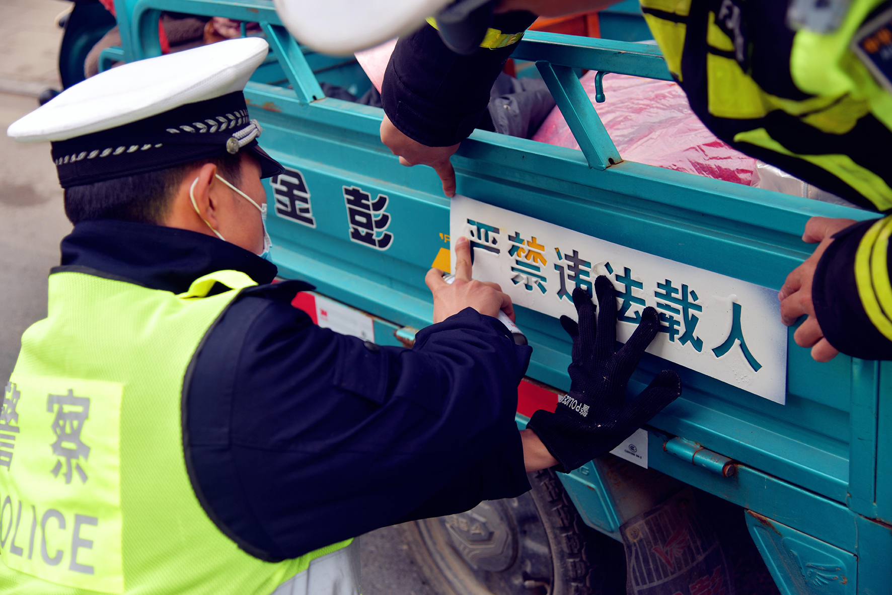 1月8日,安徽省当涂县公安局交管大队民警在石桥镇对三轮电动车违规载人、闯红灯、逆向行驶、占用机动车道等违法违规行为,进行劝导教育和警告处罚。