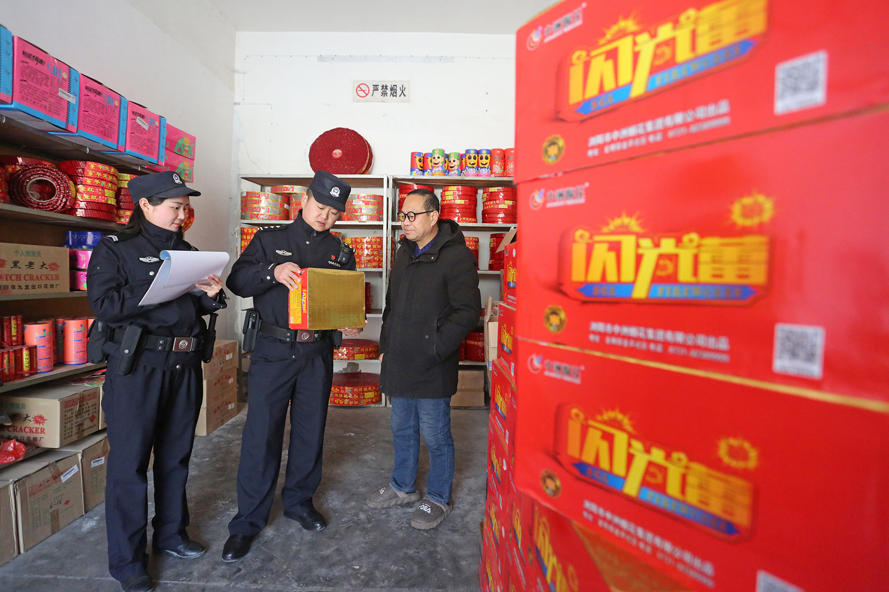 1月7日,陕西省渭南市合阳县公安局新池派出所民警对烟花爆竹销售点进行全面检查。