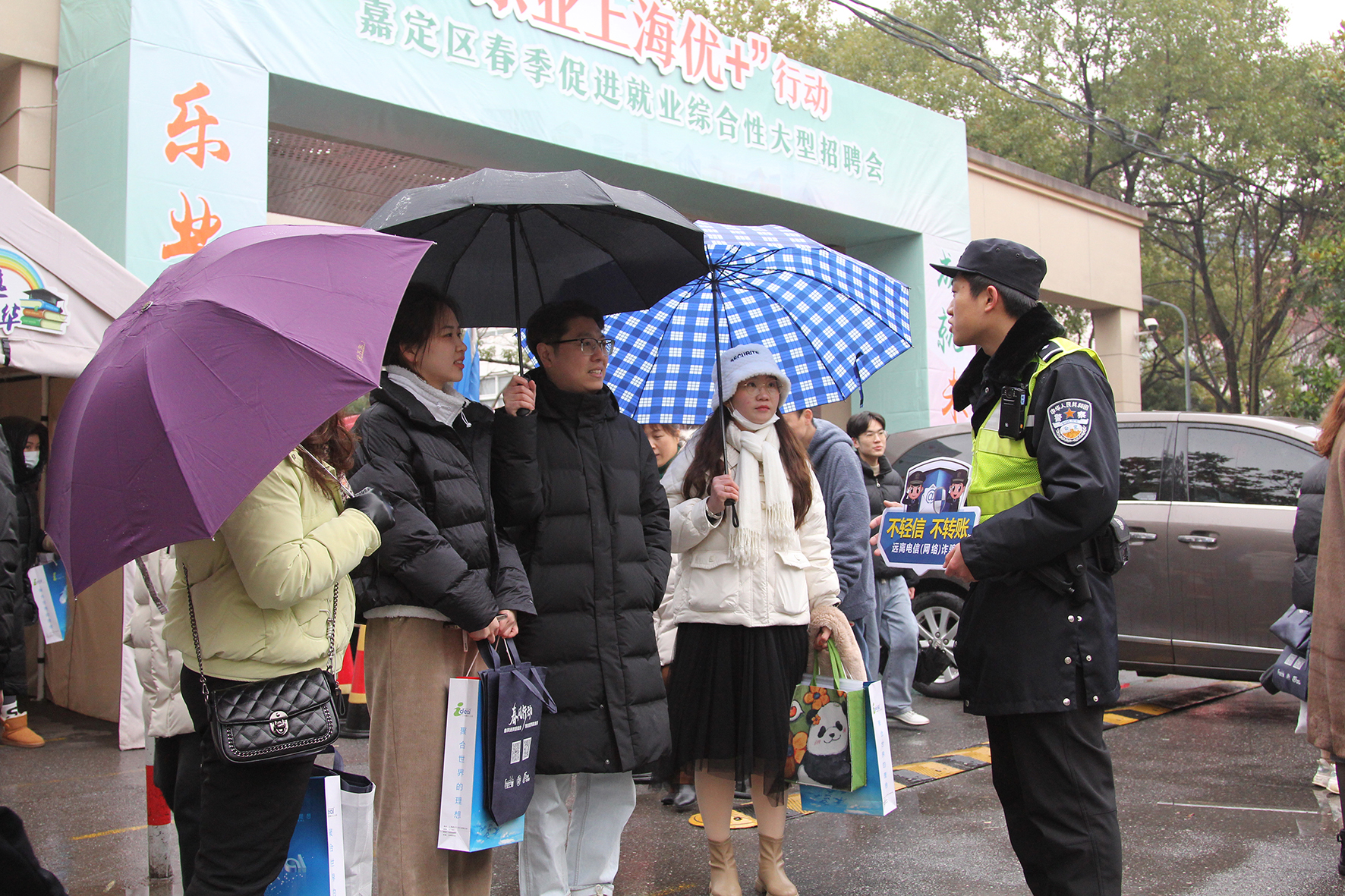 2月24日,上海市公安局嘉定分局民警冒雨在春季招聘会现场开展反电信网络诈骗、交通安全等知识宣传。