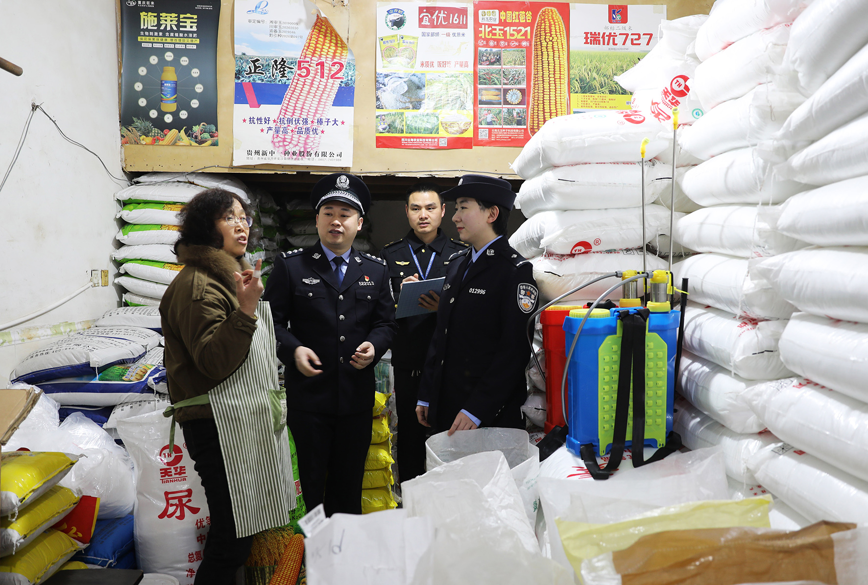 2月27日,贵州省赤水市公安局联合市场监督管理局开展“绿剑护农”行动,对辖区市场销售的种子、化肥、农药等农资产品进行拉网式检查,打击坑农害农违法行为,为春耕生产保驾护航。