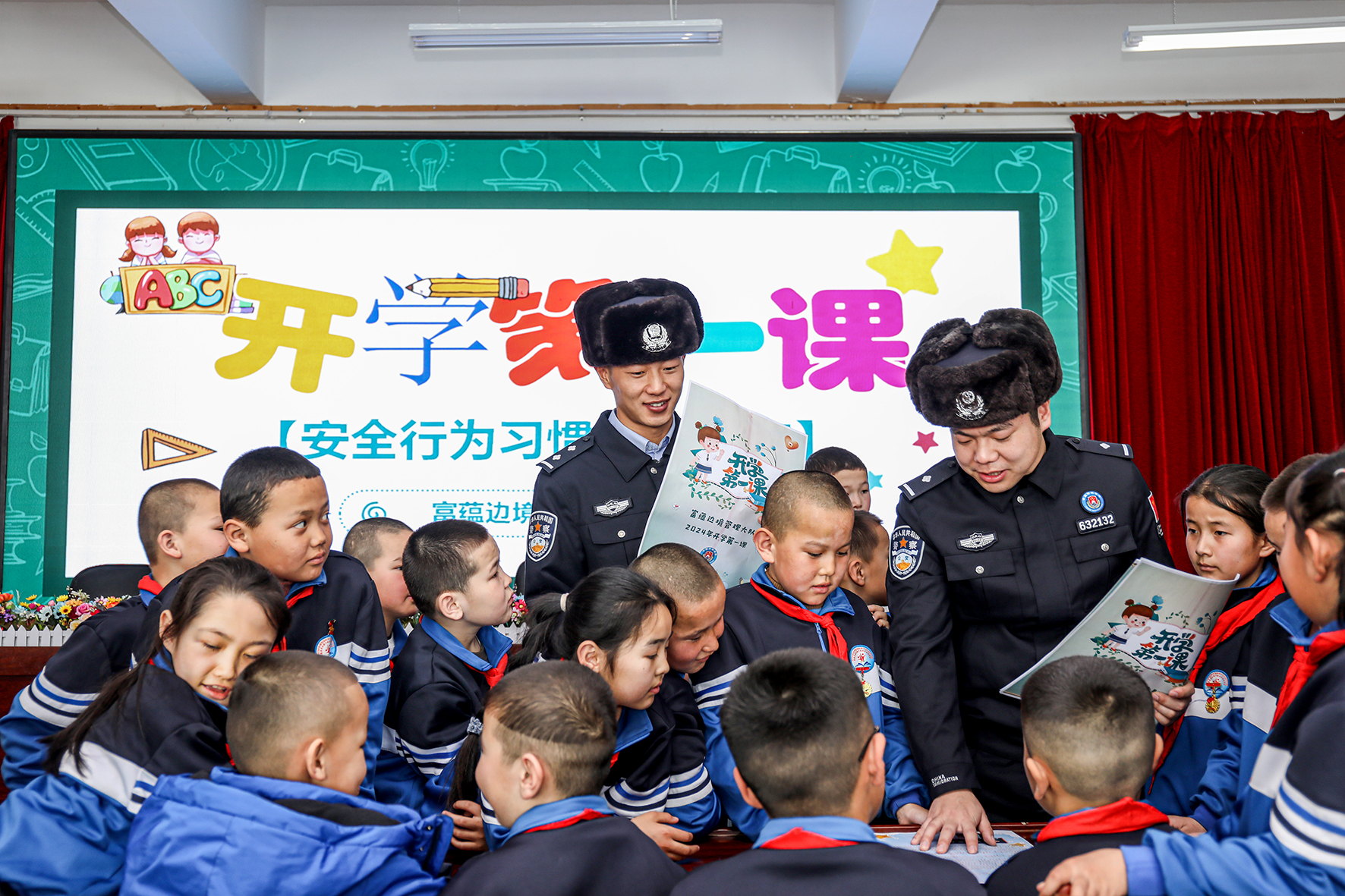 2月27日,新疆阿勒泰边境管理支队富蕴大队库尔特边境派出所的民警走进库尔特乡牧业寄宿制小学,为全体学生讲授新学期“安全教育第一课”。