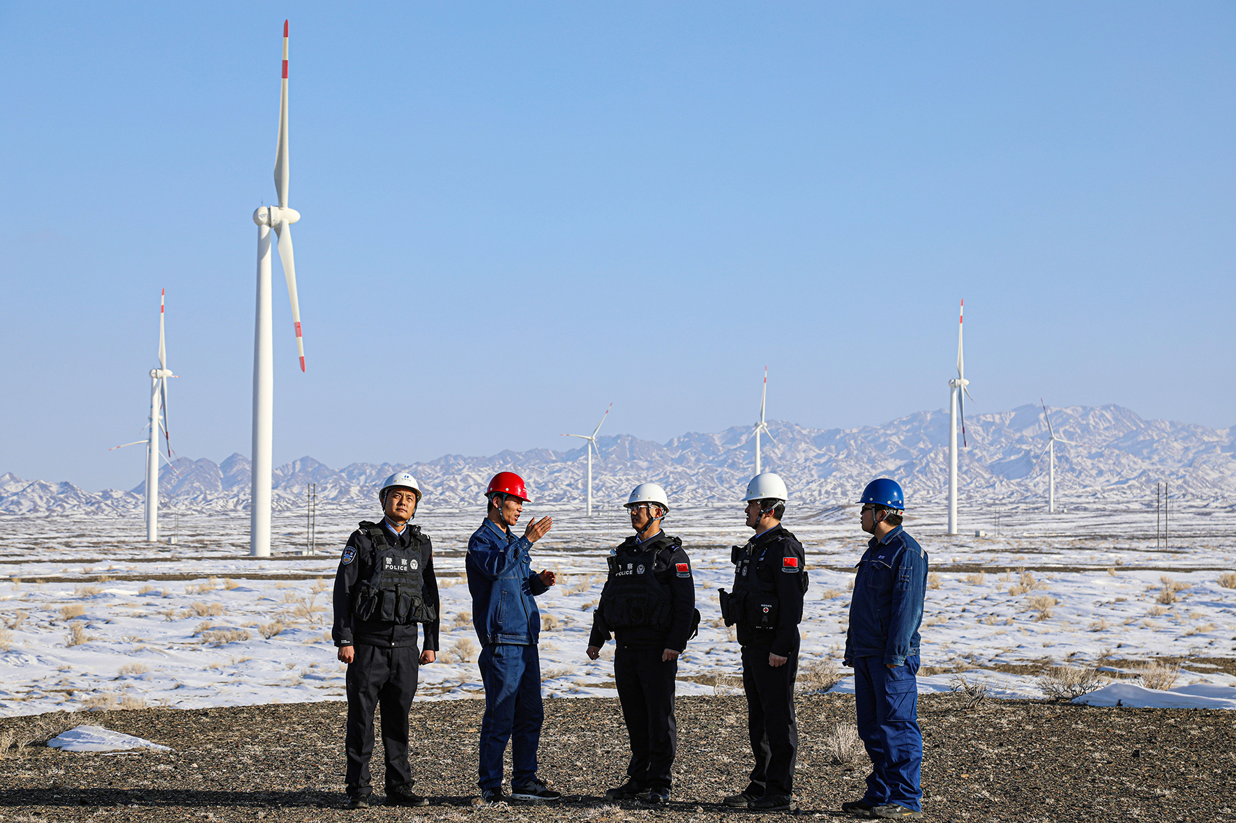 3月5日,新疆出入境边防检查总站阿勒泰边境管理支队萨尔托海边境派出所的移民管理警察深入辖区大型新能源风电场区和光伏电站开展安全生产检查。
