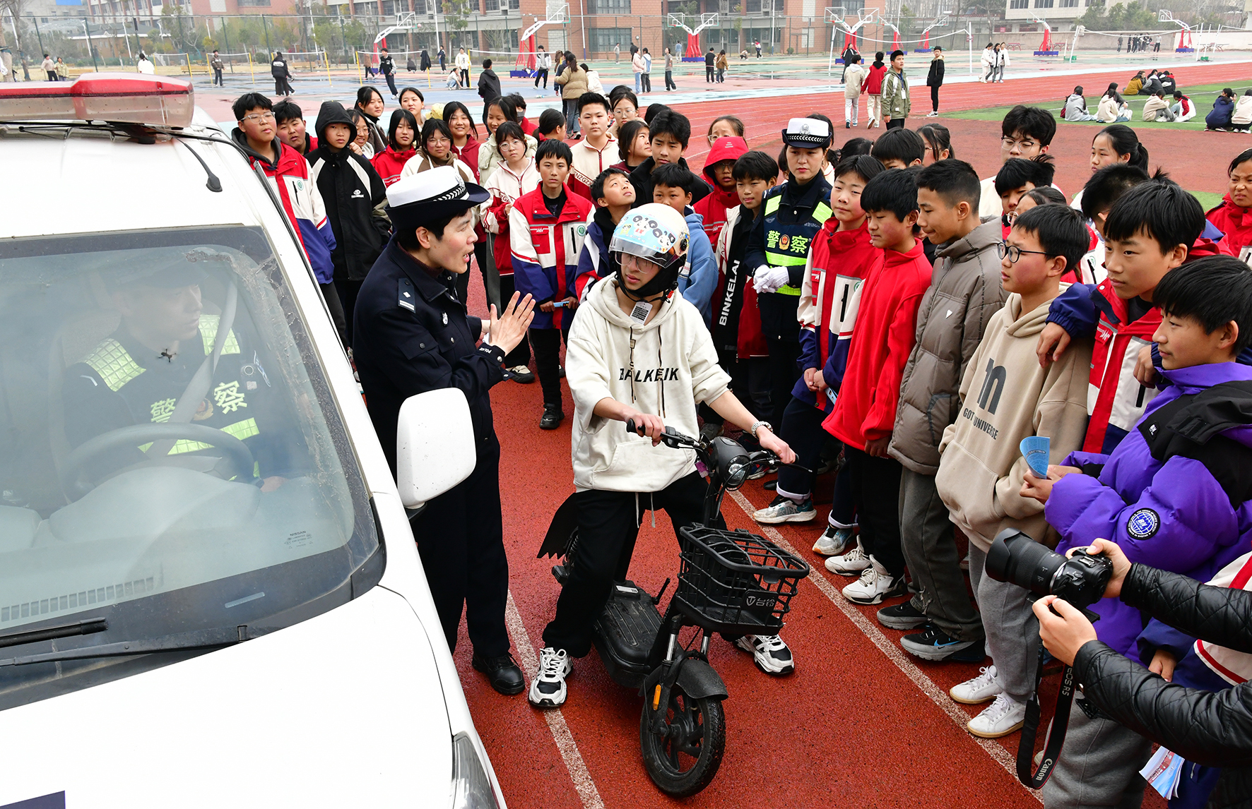 3月14日,安徽省阜南县交警在中岗中学与学生们互动体验“撞车门”交通事故模拟演示。阜南县公安局交管大队走进中岗中学开展“知危险 会避险”交通安全体验课进校园活动,增强学生们的交通安全意识和自我保护能力。