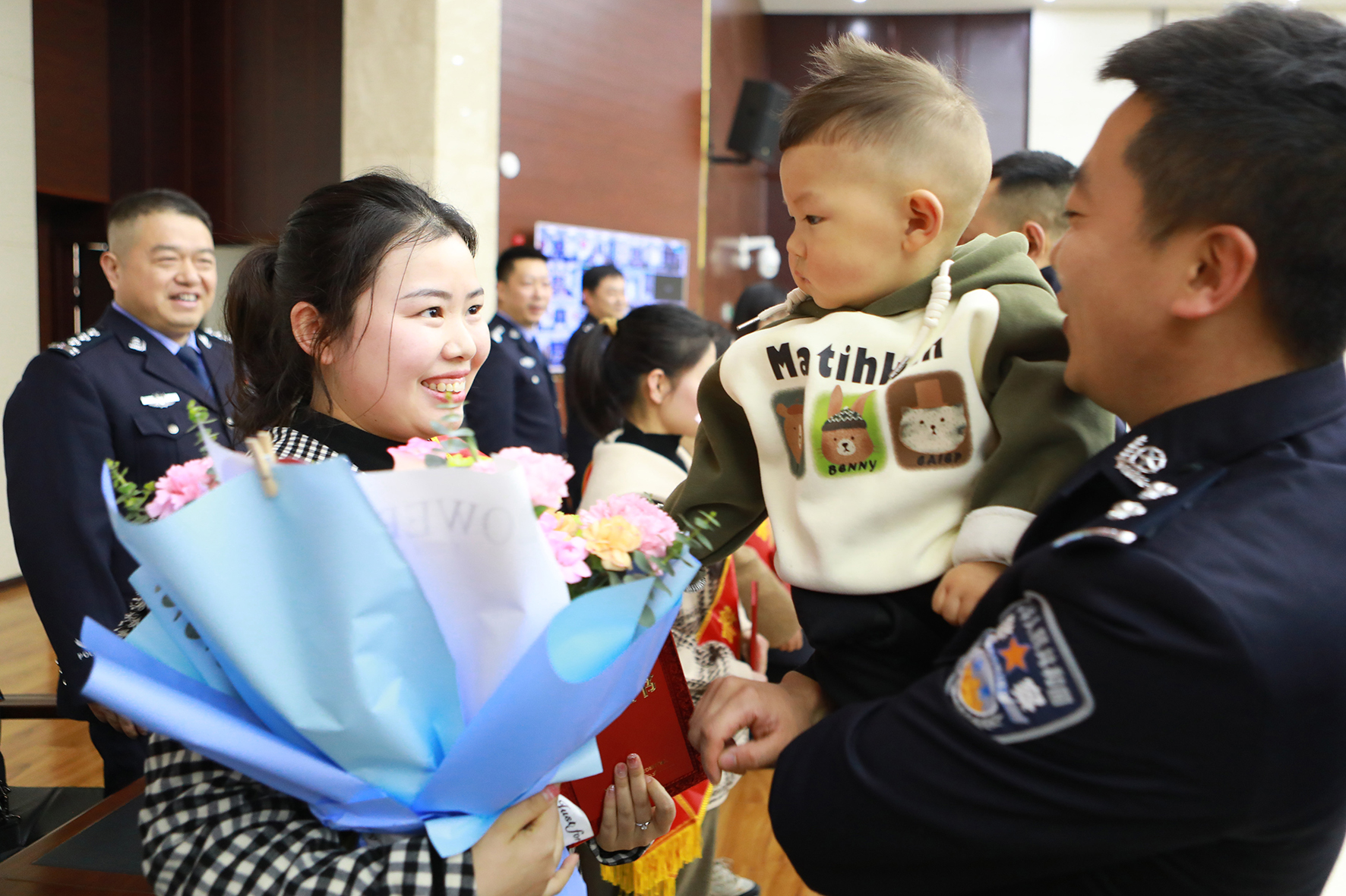 3月15日,在湖北省宜昌市秭归县公安局表彰大会现场,民警谭强怀抱一岁两个月的儿子,上台为当选“十佳警嫂”的妻子送上鲜花。