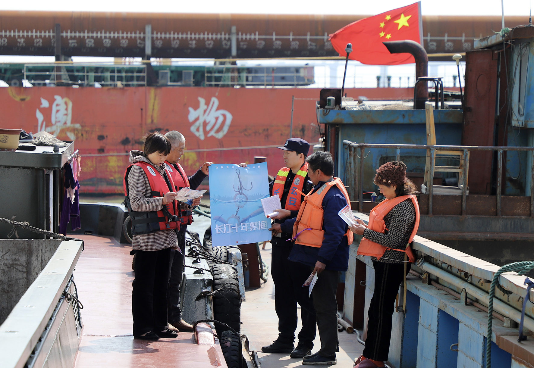 图为民警来到长江刀鲚水产种质资源保护区,向船员开展普法教育宣传。