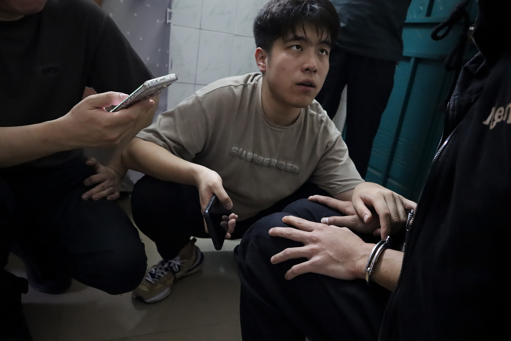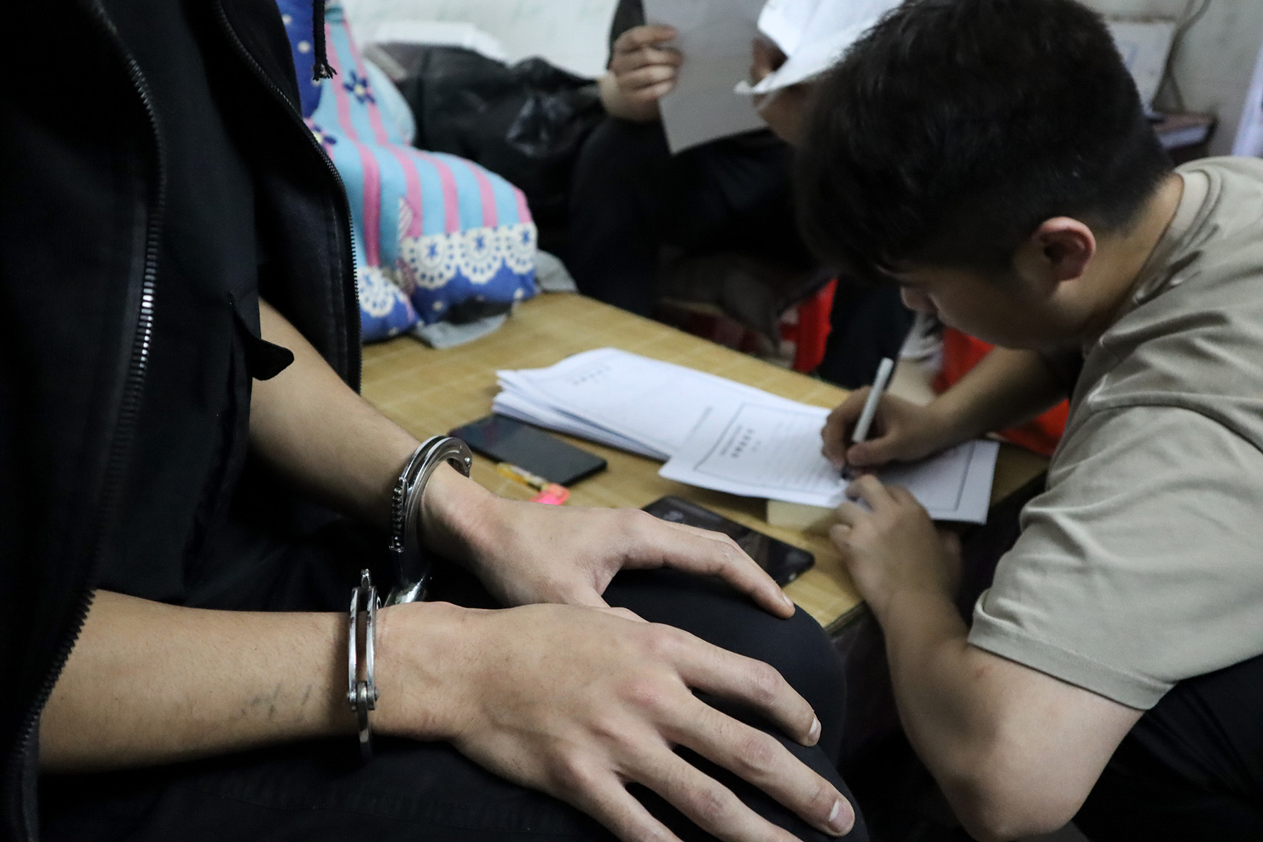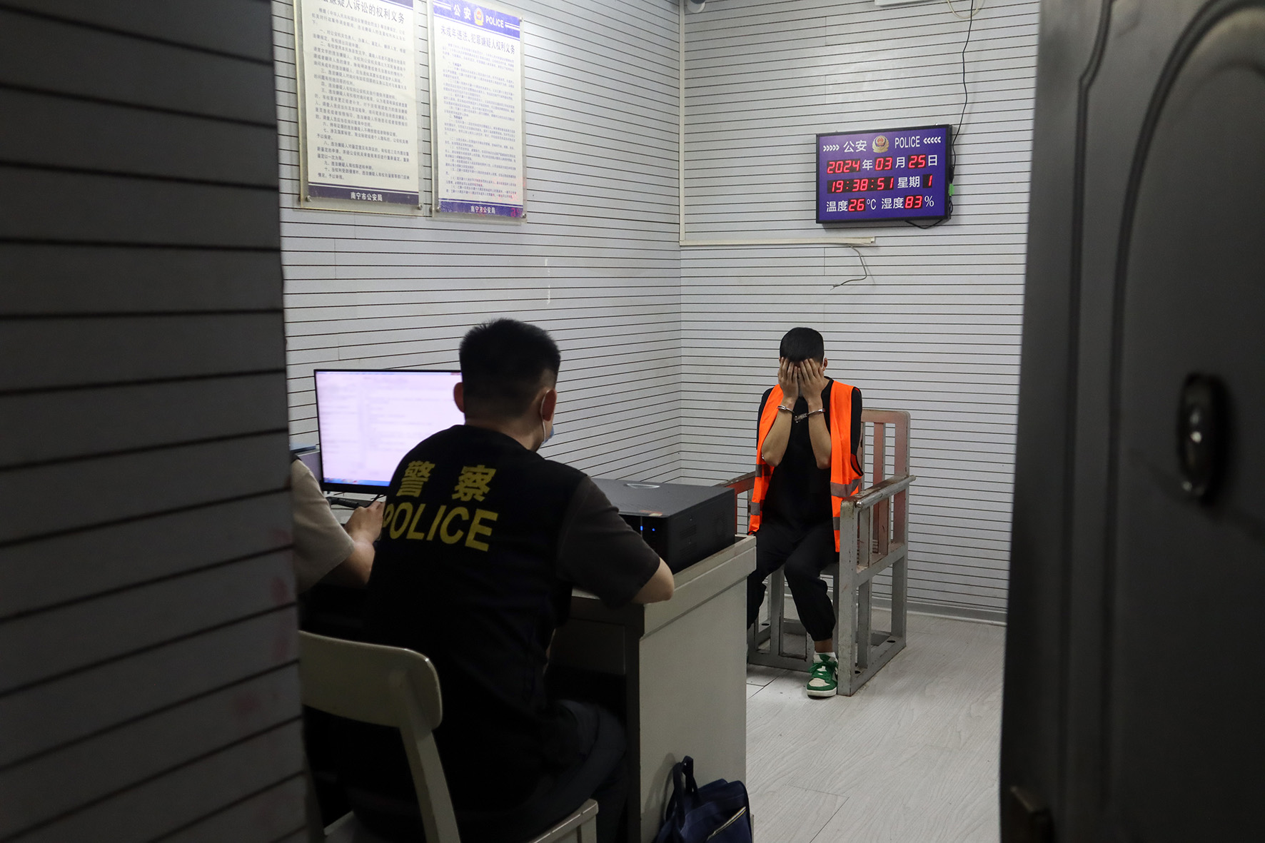 3月25日,在广西南宁市公安局江南派出所,山东省济南市公安局市中区分局民警对电诈嫌疑人张某进行审讯。