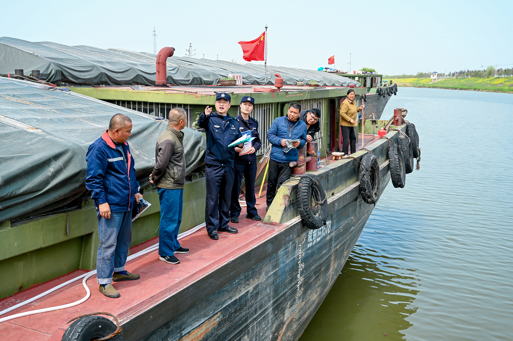 “劝君不吃四月鱼,万千鱼仔在腹中”。3月31日,安徽省马鞍山市和县公安局石杨派出所民警向停泊在滁河水域的船主宣传长江、滁河等水域禁渔政策,倡导广大船员主动参与长江生态环境保护,莫让“渔网”触“法网”。