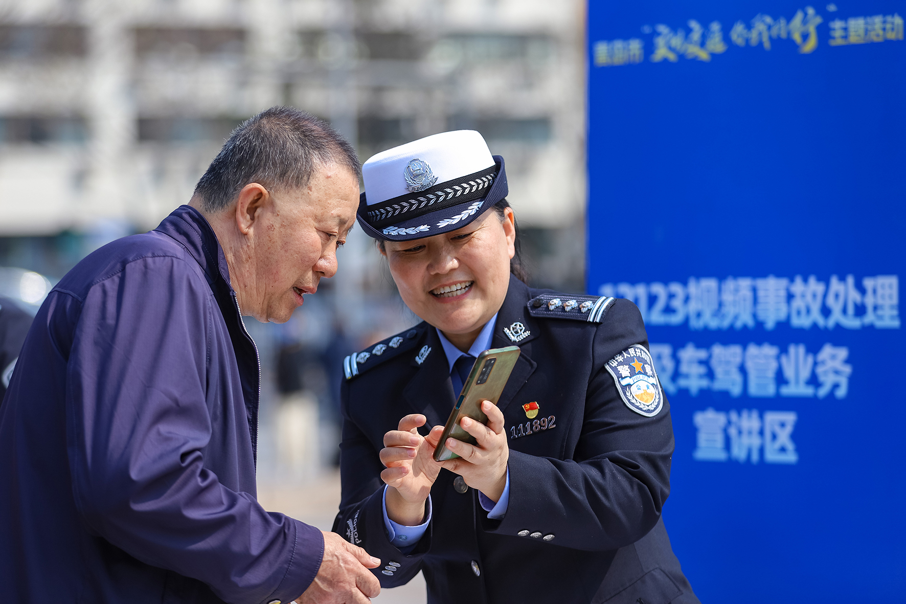 图为民警向市民讲解“交管12123”App事故视频快处操作流程。