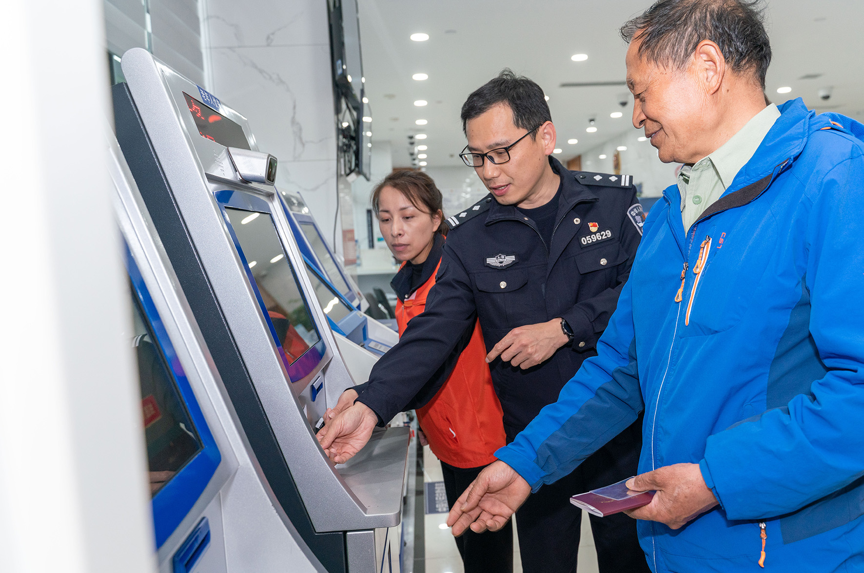 图为4月17日,民警协助群众通过自助签注设备办理业务。