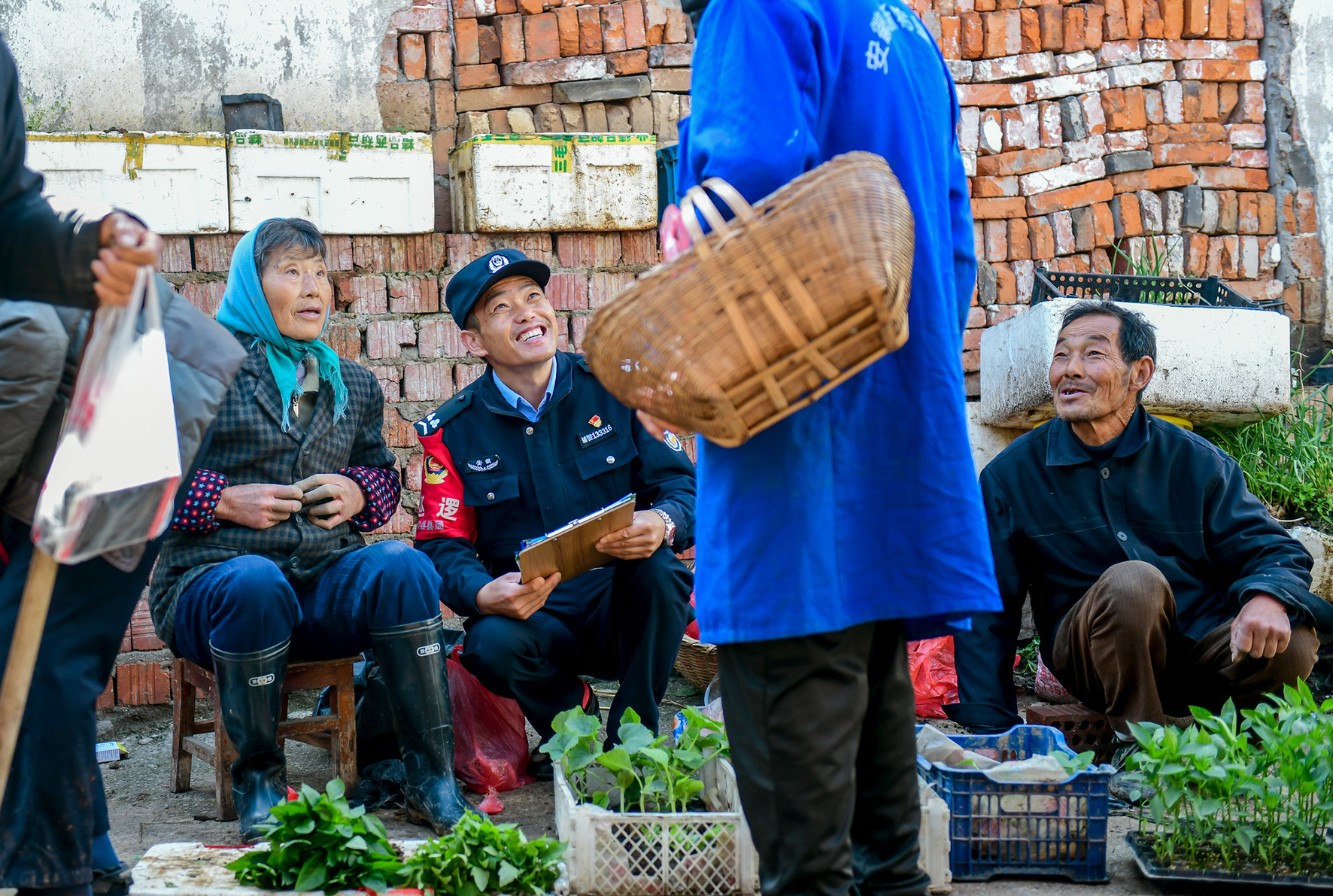 4月18日,安徽省马鞍山市和县公安局民警向“赶集”的群众了解社会治安动态,倾听对公安机关的意见建议。