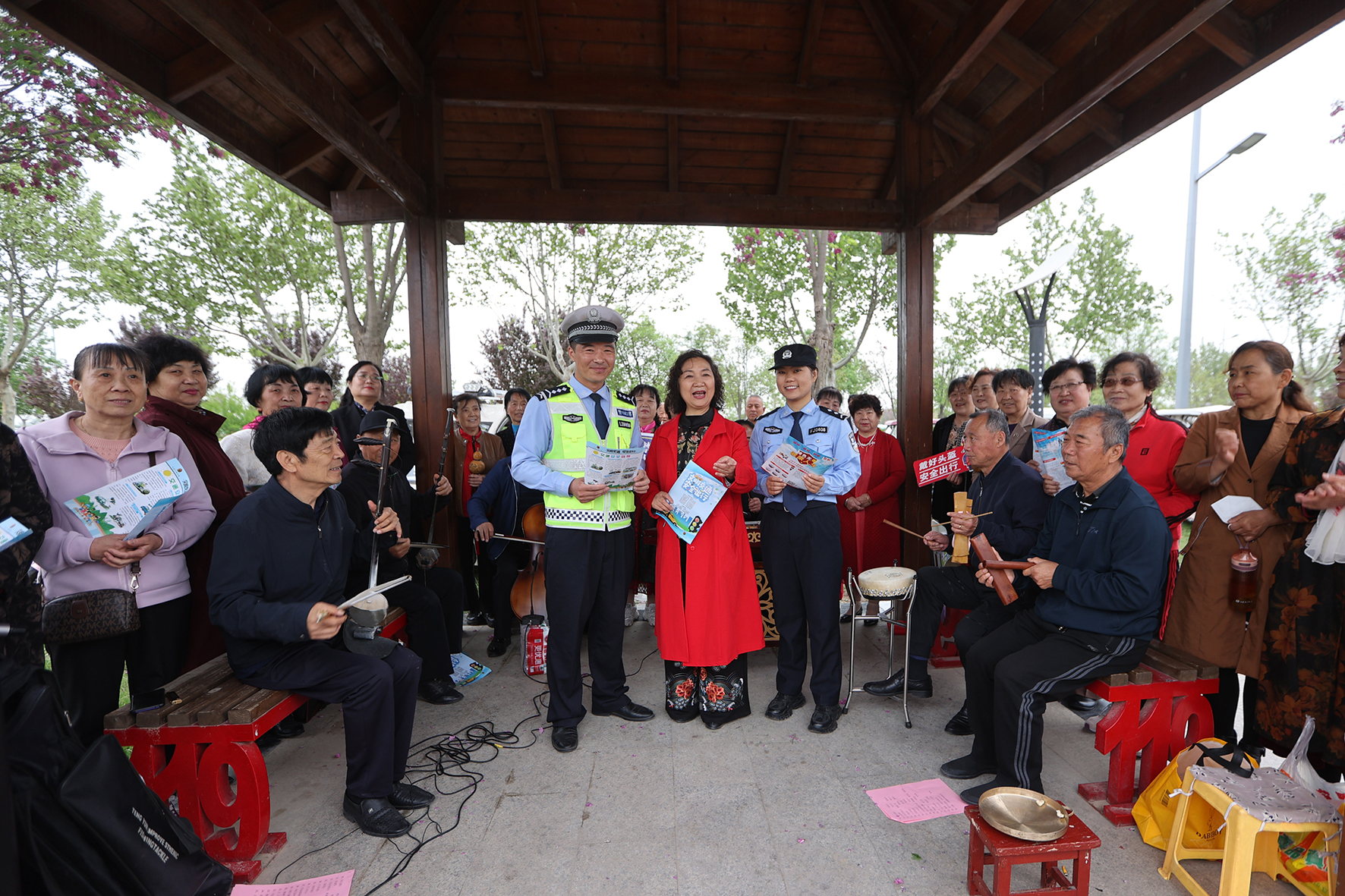 4月19日,陕西省大荔县公安局交警大队民警、禁毒大队民警携手,借助老年大学“自乐班”演出阵地开展交通安全和禁毒宣传。