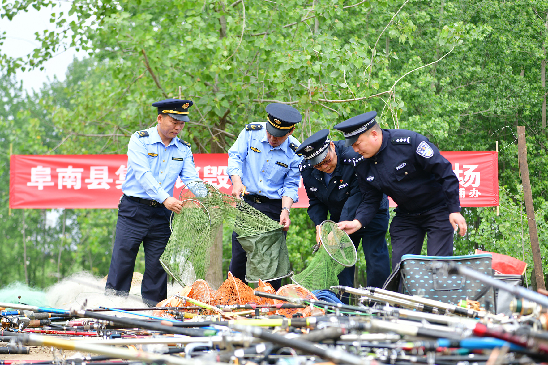 4月23日,安徽省阜南县公安森林民警和农业执法人员在淮河流域曹集镇集中销毁一批违法捕捞渔具。