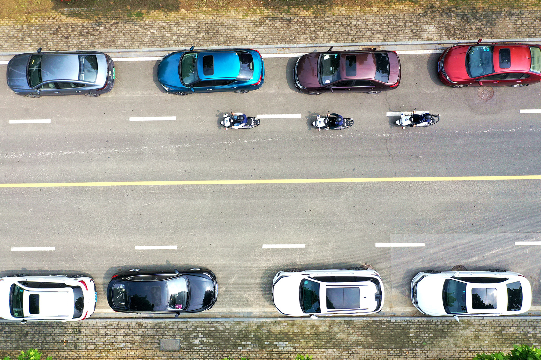 图一:网格员骑着由派出所配备的电动车在工业园区道路上巡逻。