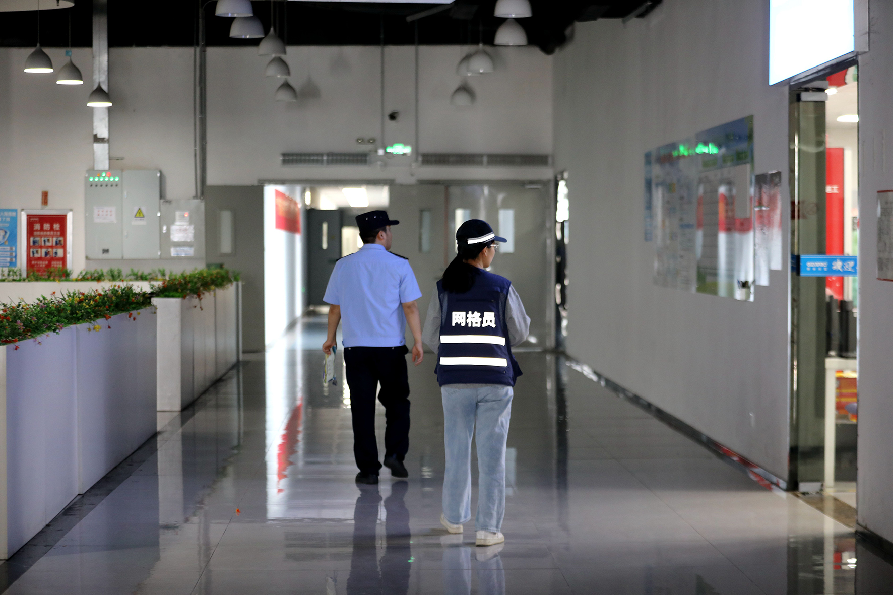图二:片区辅警与网格员在企业里检查安全隐患。