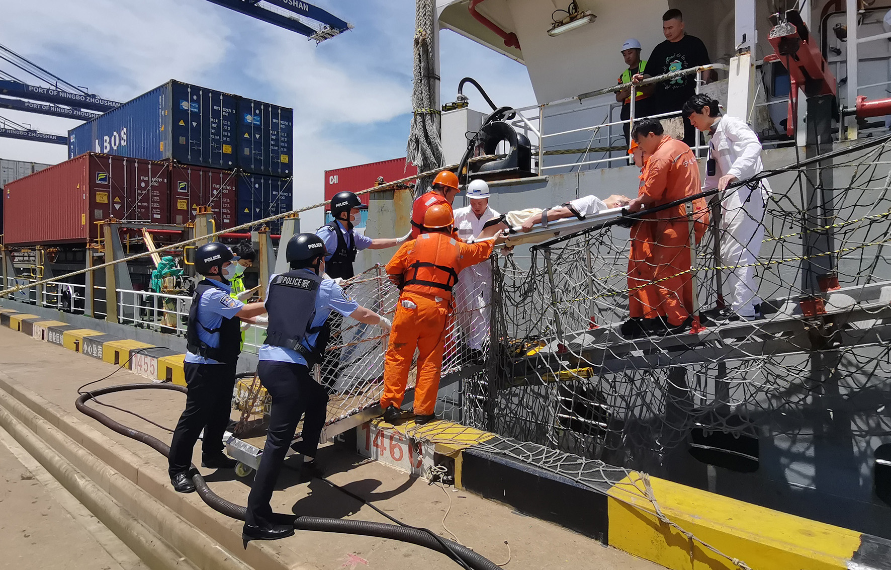 5月9日,浙江宁波出入境边防检查站综合执勤七队开通“绿色通道”紧急救助一名中国籍受伤船员。