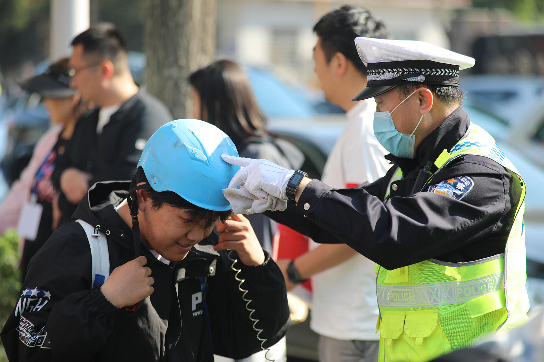 5月28日早高峰,辽宁省阜新市公安局局交警支队细河大队交警联合民族街学校教师对骑乘电动车不戴头盔违规出行的学生进行劝导教育。