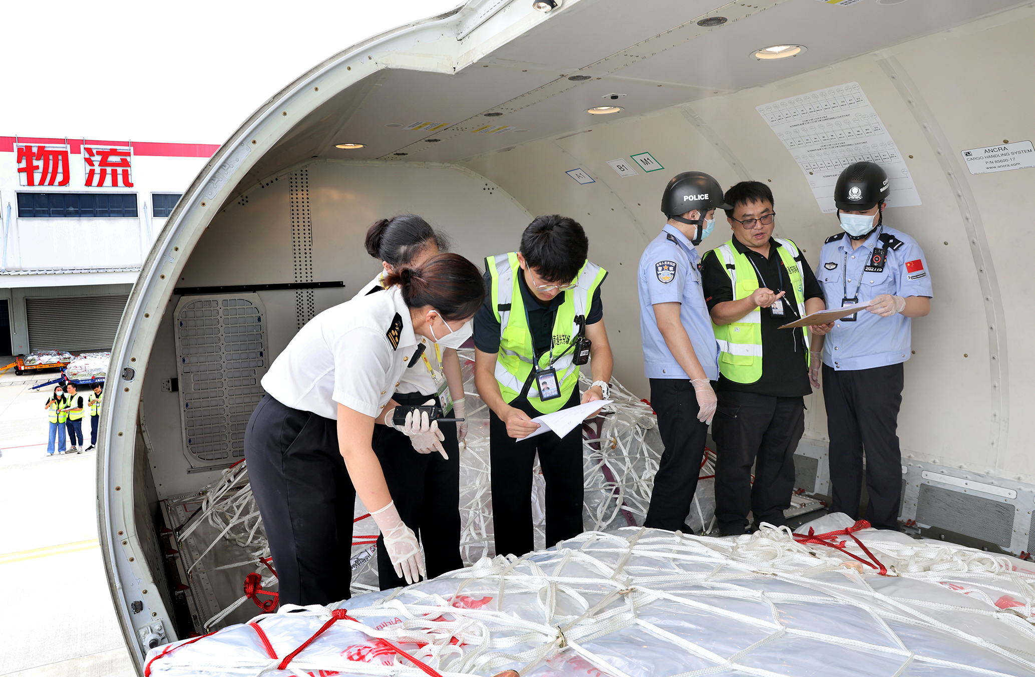 6月27日,南通海关关员(左)在货舱中对出口货物开展实地监管,南通边检民警进行清舱检查。当日,由中国外运运营、京东航空执飞的南通至仁川国际货运航线在南通机场成功首航。