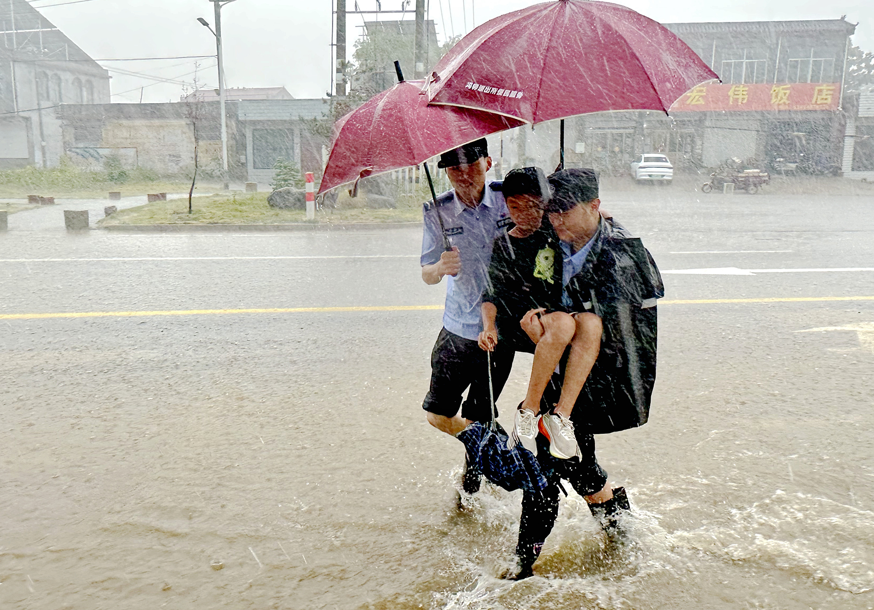 7月1日,山东省枣庄市公安局山亭分局冯卯派出所民辅警冒着暴雨将一名被困儿童安全护送到家。