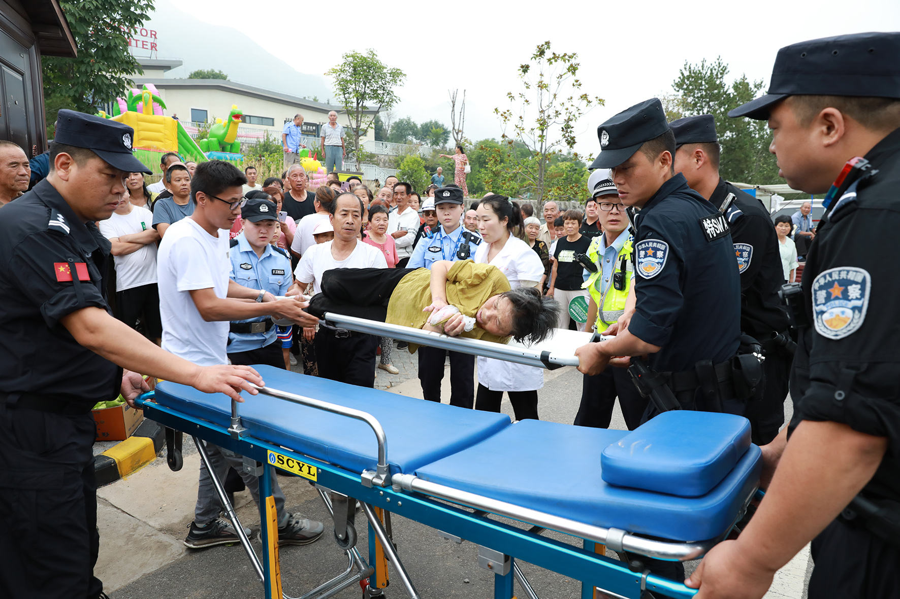 图为执勤民辅警与医护人员正在救助一名昏厥的游客。