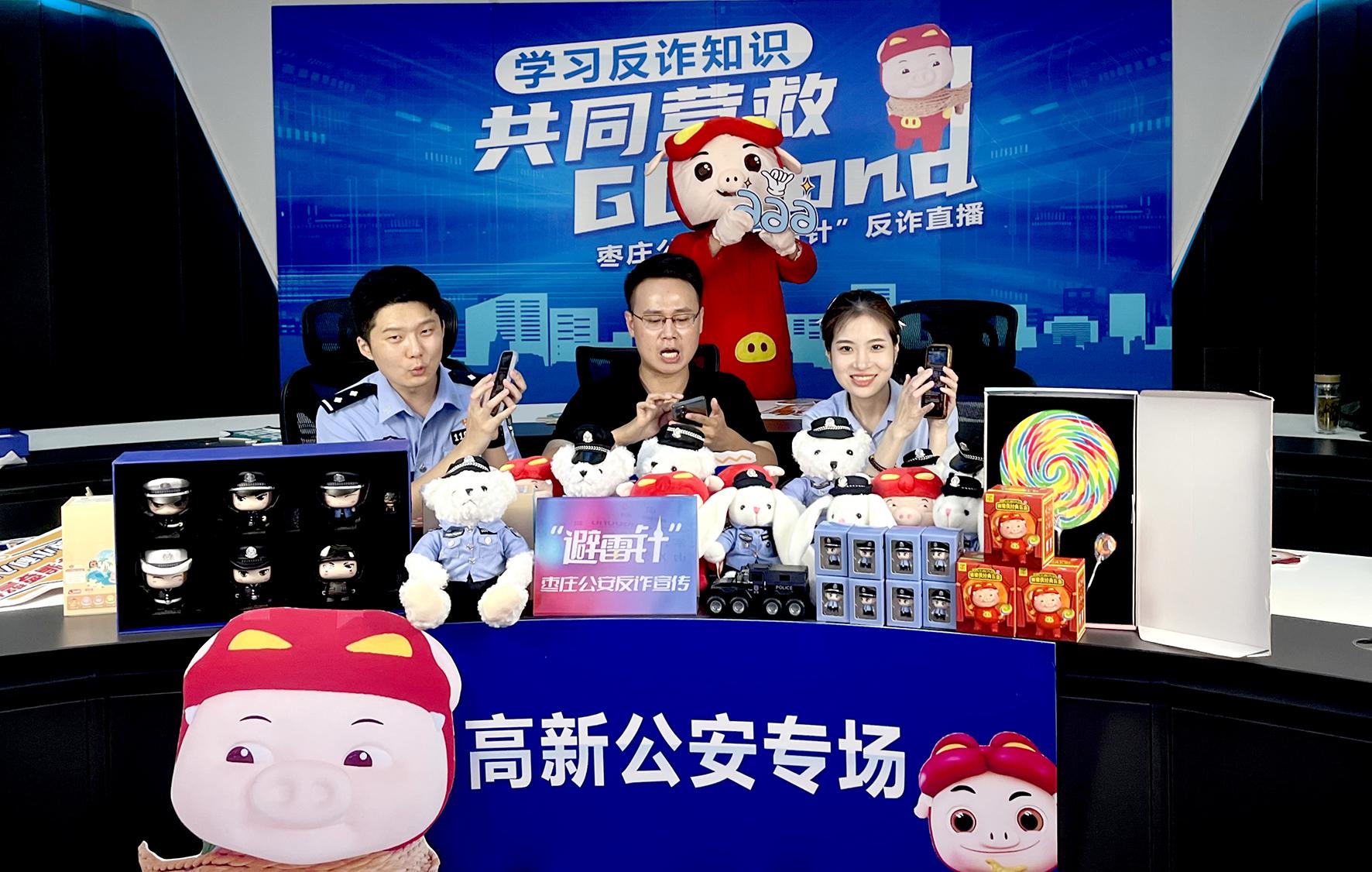 7月28日,在山东省枣庄市公安局高新分局“避雷针”反诈专场直播间,民警和反诈志愿者通过网络直播宣传反电诈知识。
