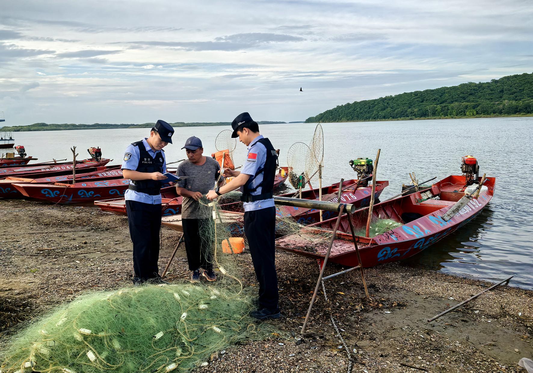 图为7月28日,饶河县公安局四排边境派出所民警在四排赫哲族乡边境水域进行治安巡查,向渔民开展边境法律法规宣传。