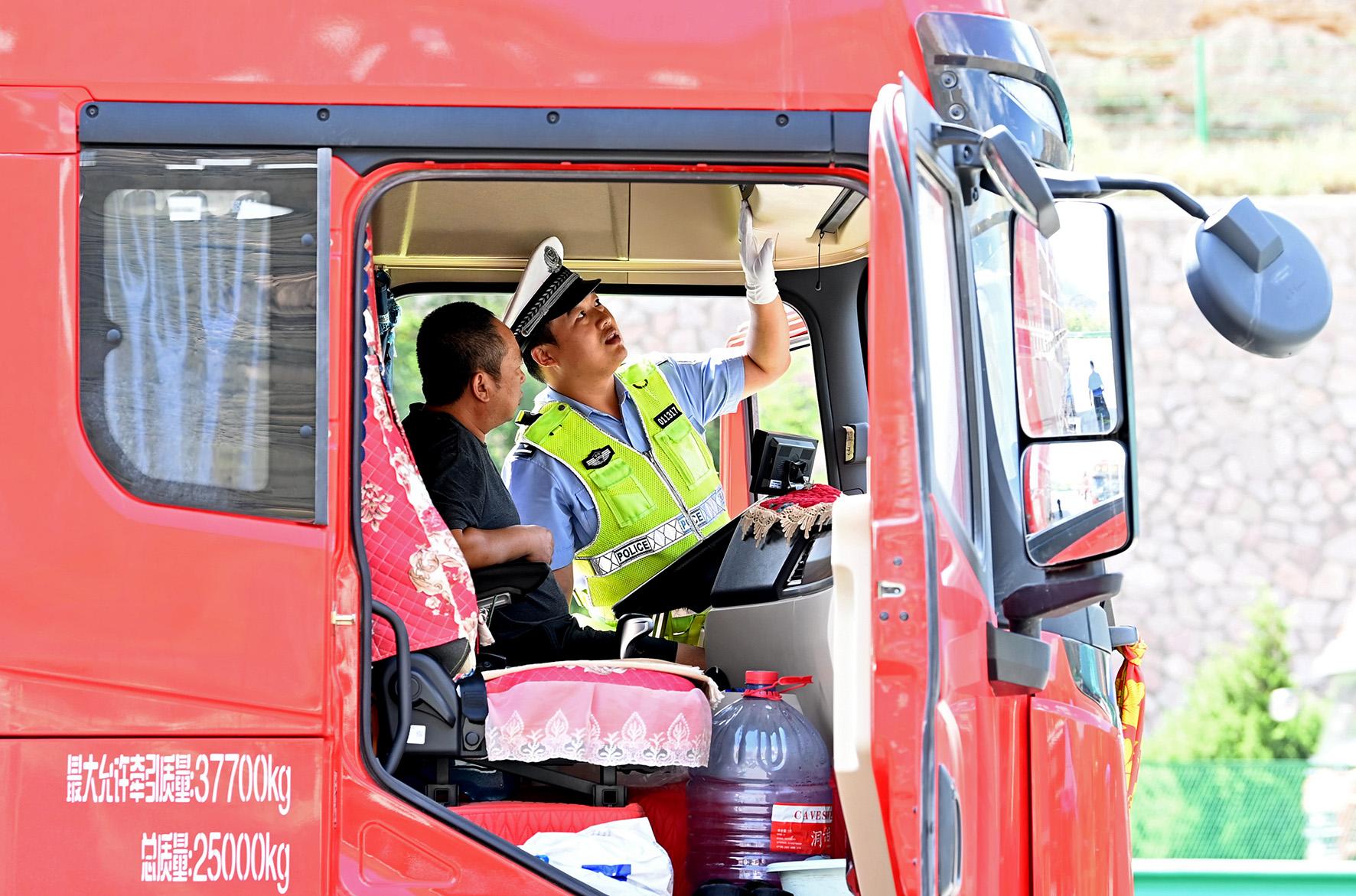 7月31日,甘肃省兰州市公安局交警支队民警在兰海高速兰临段联防联控交管站,对过往三轴以上的大货车逐车进行登记检查,提醒驾驶人严格遵守高风险路段规定,注意防范高温天气,切勿疲劳驾驶。