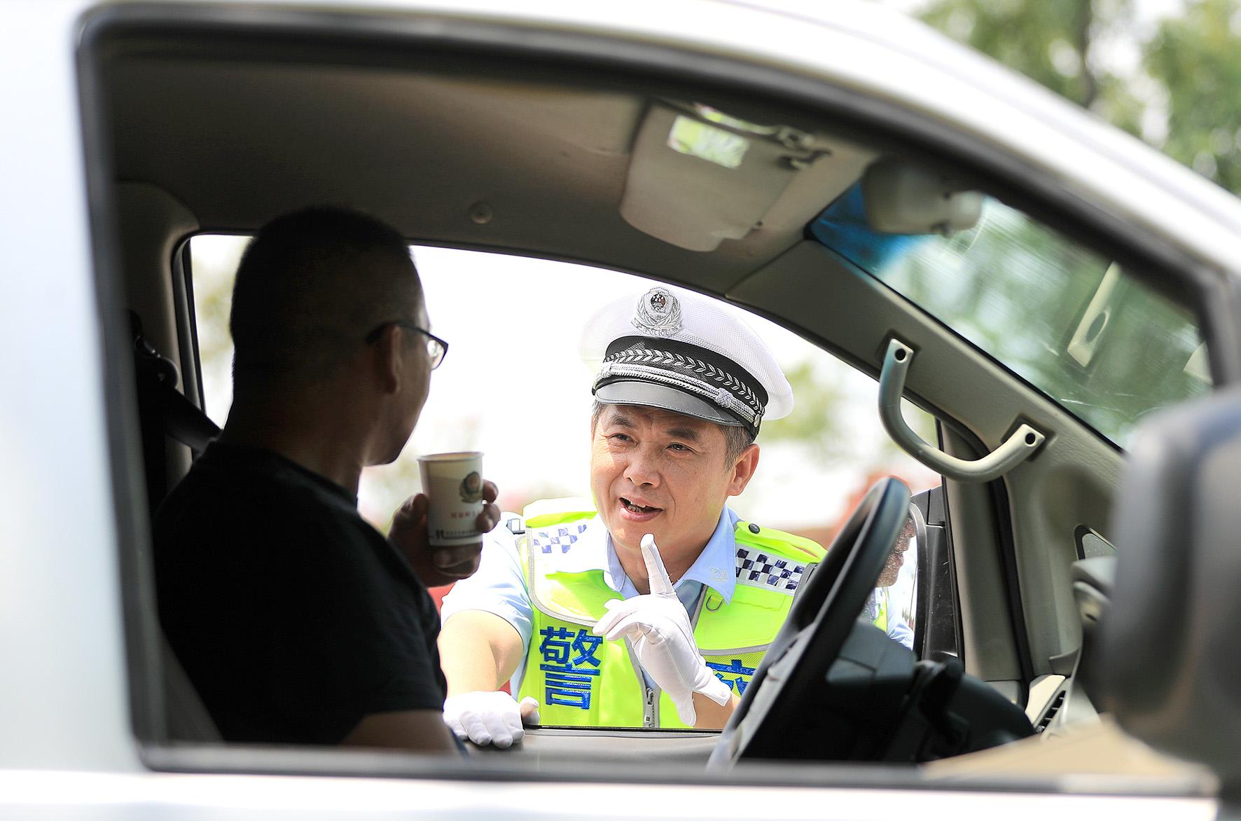 “来,喝口凉茶!”8月5日,湖北省荆门市公安局交警支队屈家岭大队民警在S247省道,免费为过往司乘人员提供“平安凉茶”。