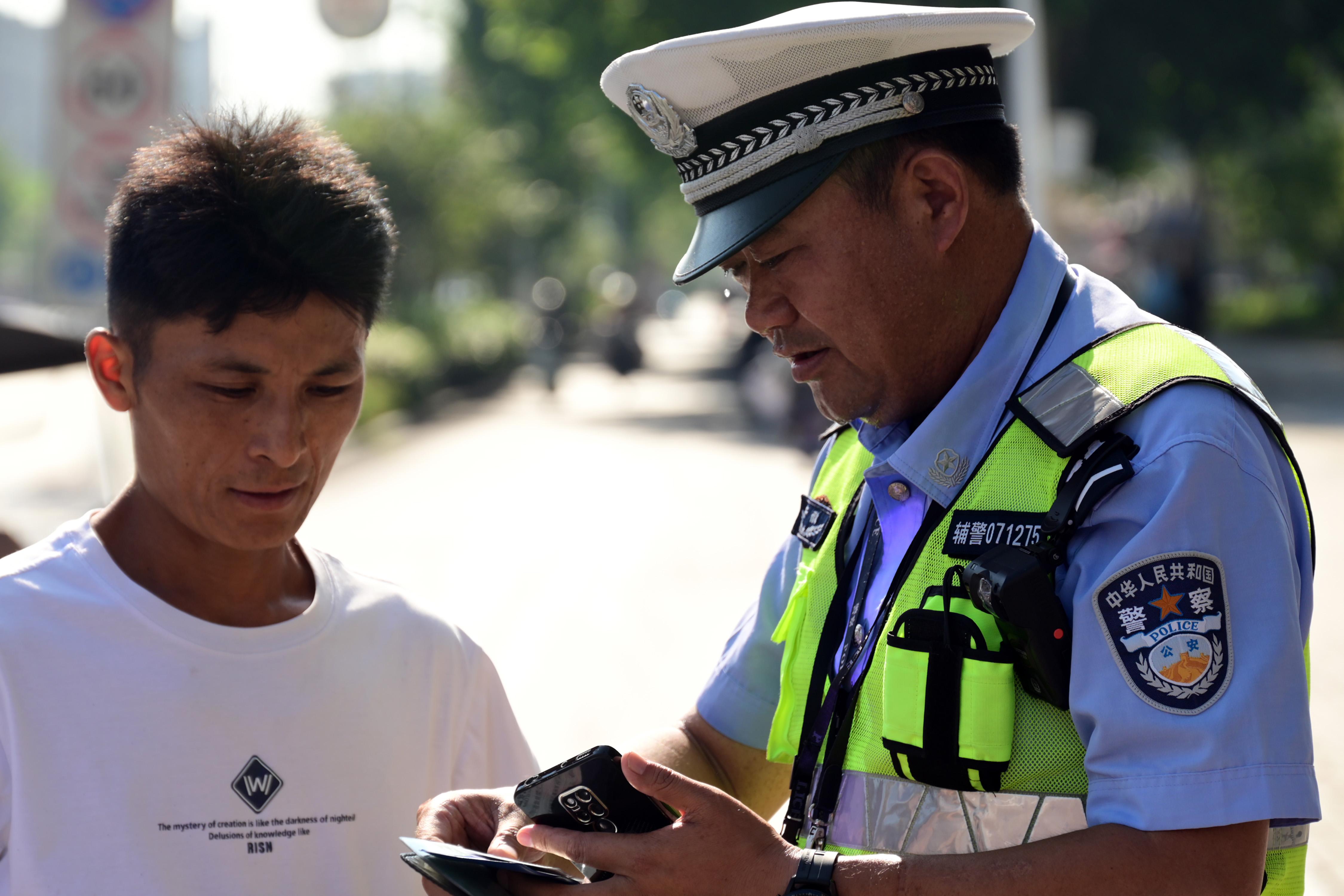 8月5日,安徽省固镇县公安局交管大队的民警辅警冒着38摄氏度高温在浍河路指挥疏导交通、提示安全驾驶。