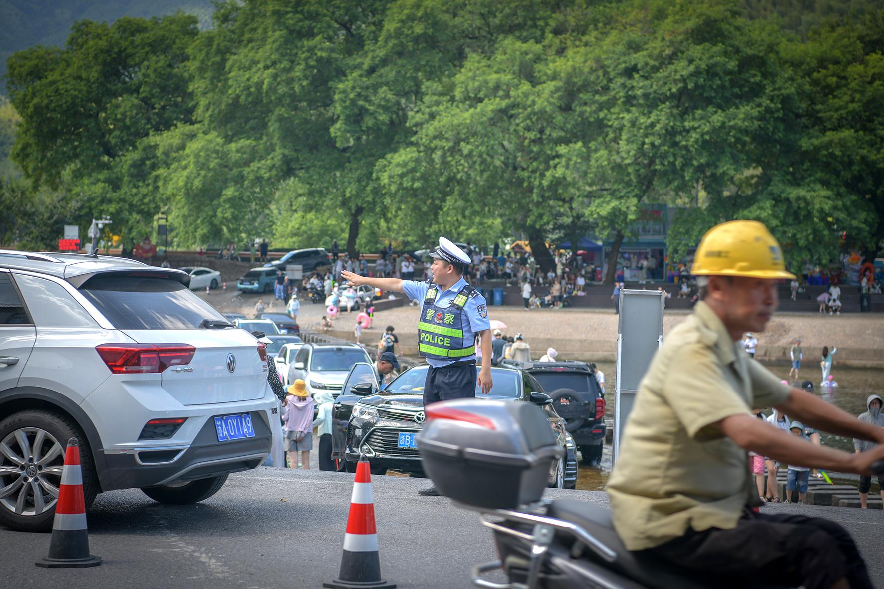 8月3日,气温40度。安徽省泾县公安局民警在泾县蔡村镇“月亮湾”景区疏导交通。