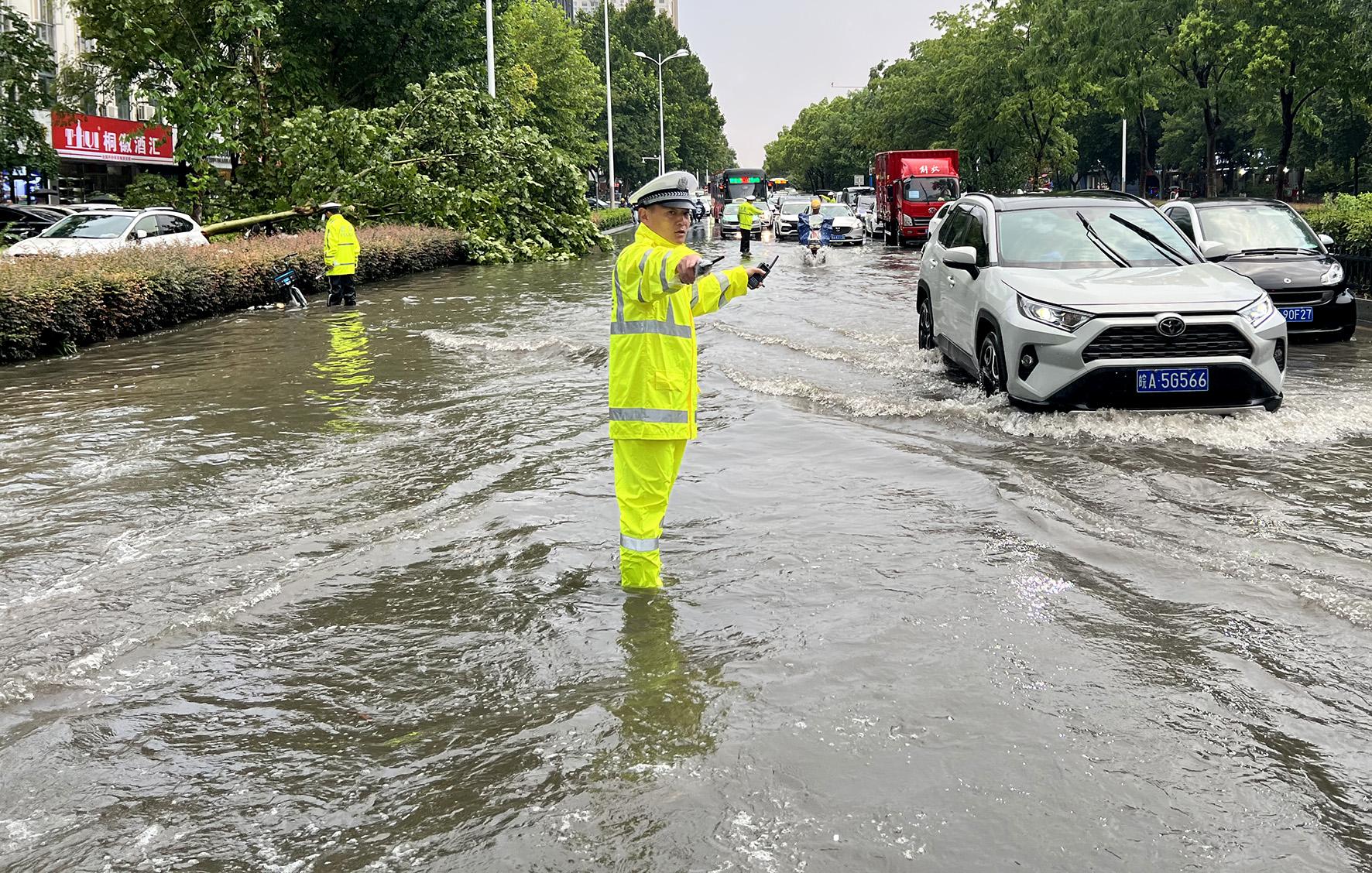 图为合肥市公安局交警支队蜀山大队民警正在积水路段排查隐患,维护交通秩序。
