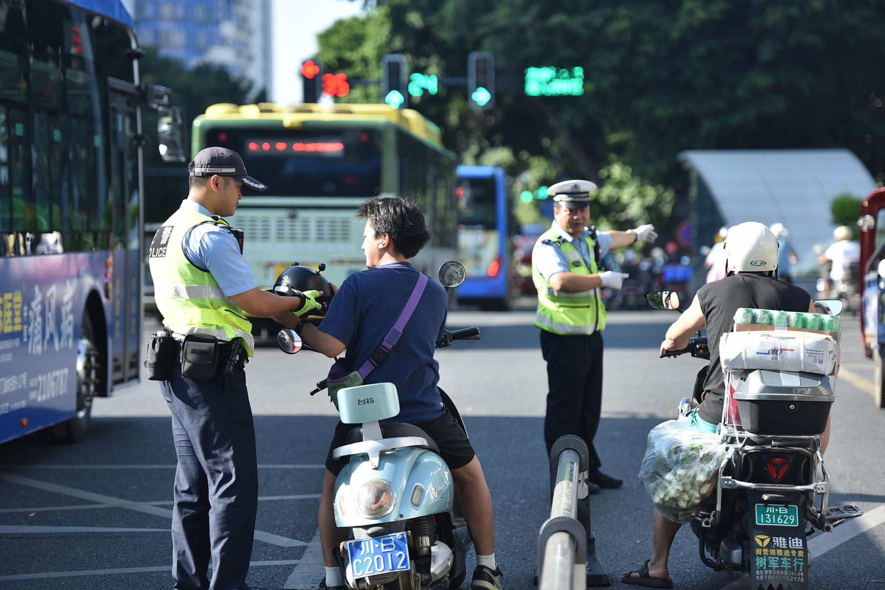 图为8月13日,民辅警在路口纠正劝导骑乘人员要规范佩戴安全头盔。