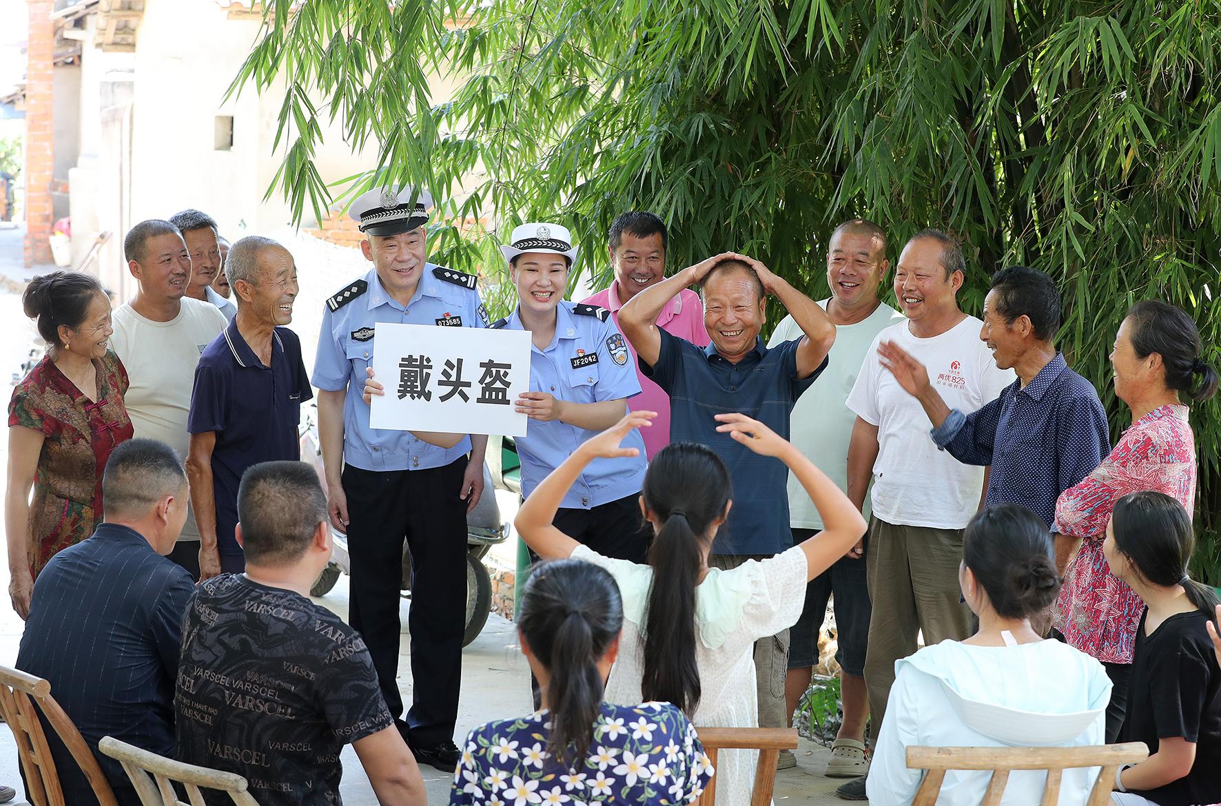 8月13日,在湖北省荆门市沙洋县李市镇新城村,沙洋县公安局交警大队民警通过“我比你猜”趣味活动,向村民宣传交通安全知识。