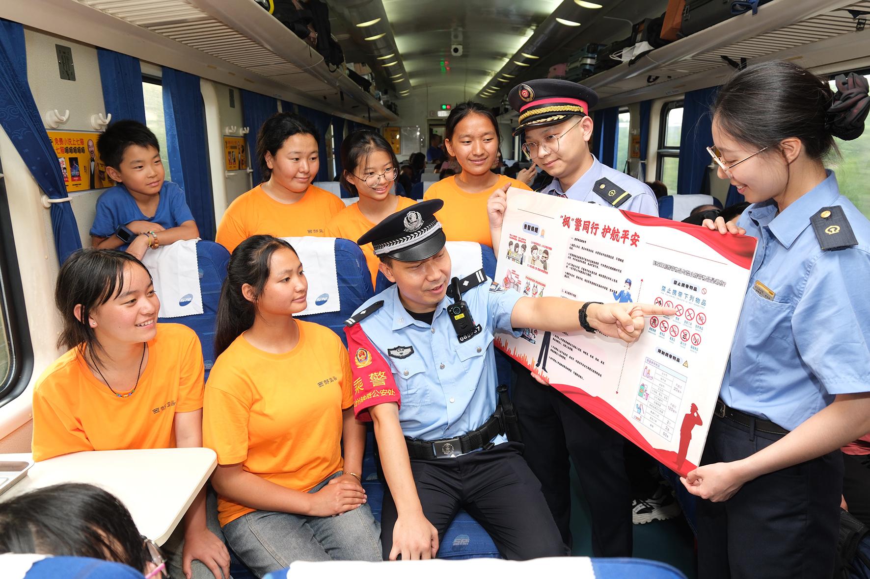 8月17日,杭州铁路公安处乘警支队乘务一大队联合杭州客运段甬西车队在宁波开往西安的K466次列车上,开展“‘枫’警同行 护航平安”的乘车安全宣讲活动。
