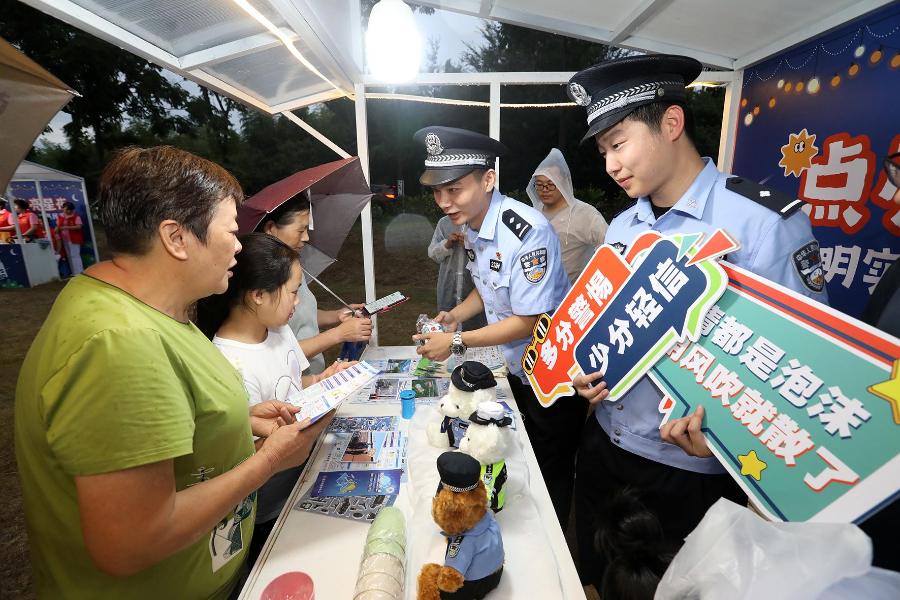 8月19日,江苏省宜兴市公安局太华派出所民警在“点亮星夜”文明实践惠民夜集活动现场向群众讲解反诈和禁毒知识,提高群众防骗和禁毒意识。